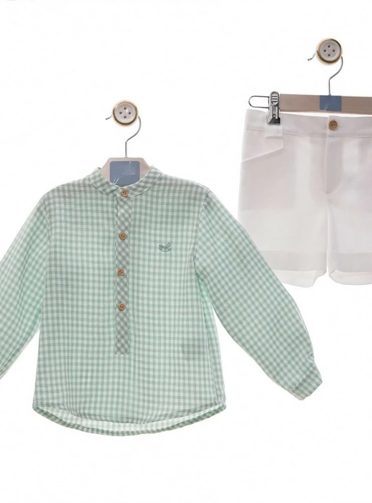La camisa está Confeccionada en muselina con estampado Vichy verde agua y blanco y pantalón de loneta blanca.