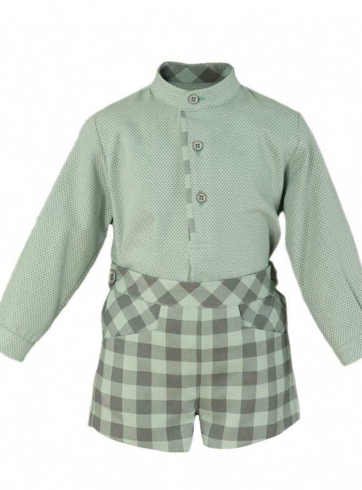 Camisa de viella con fondo verde empolvado y topito en gris, lleva cuello mao. Pantalón cuadro vichy verde y gris.