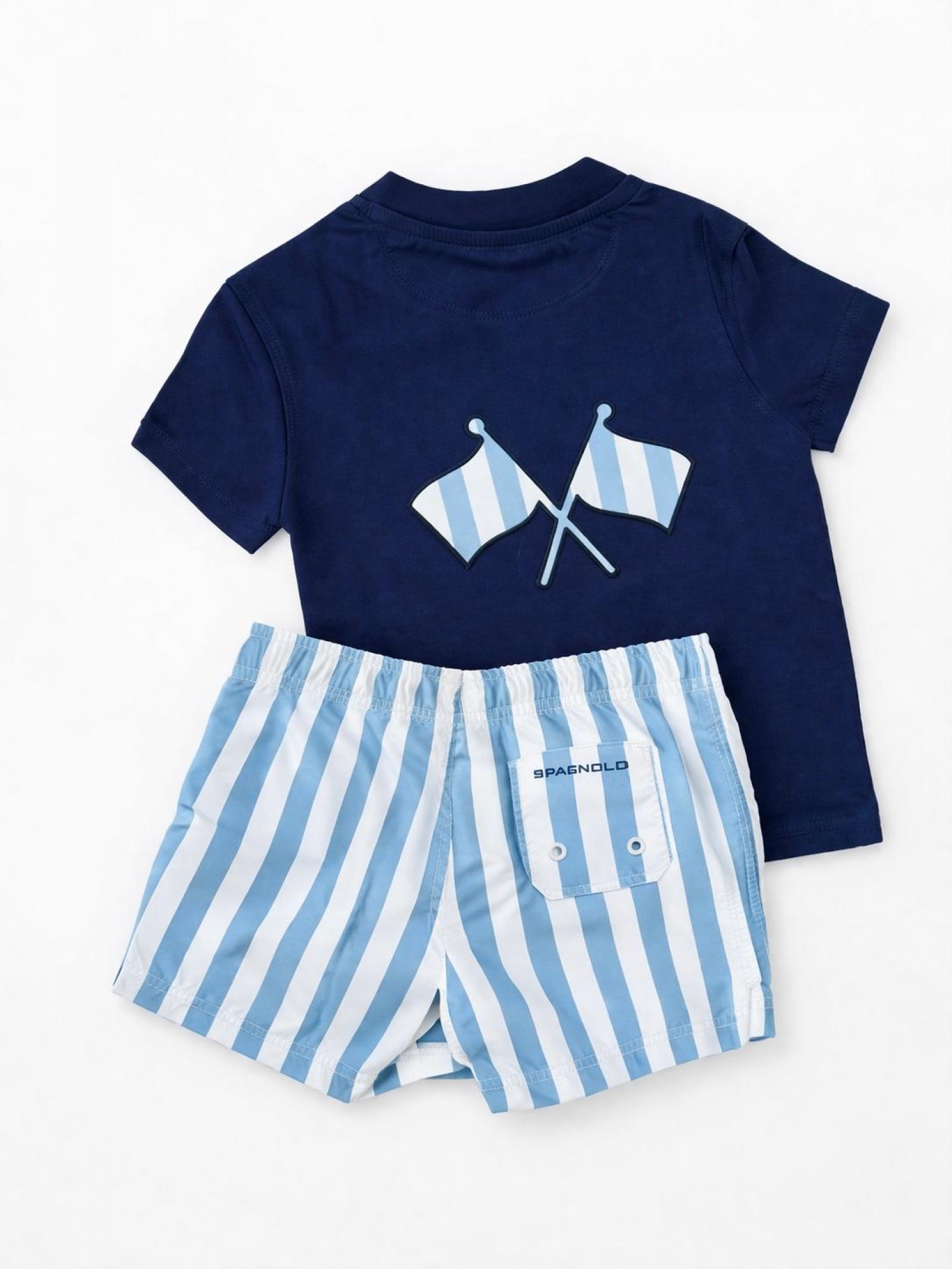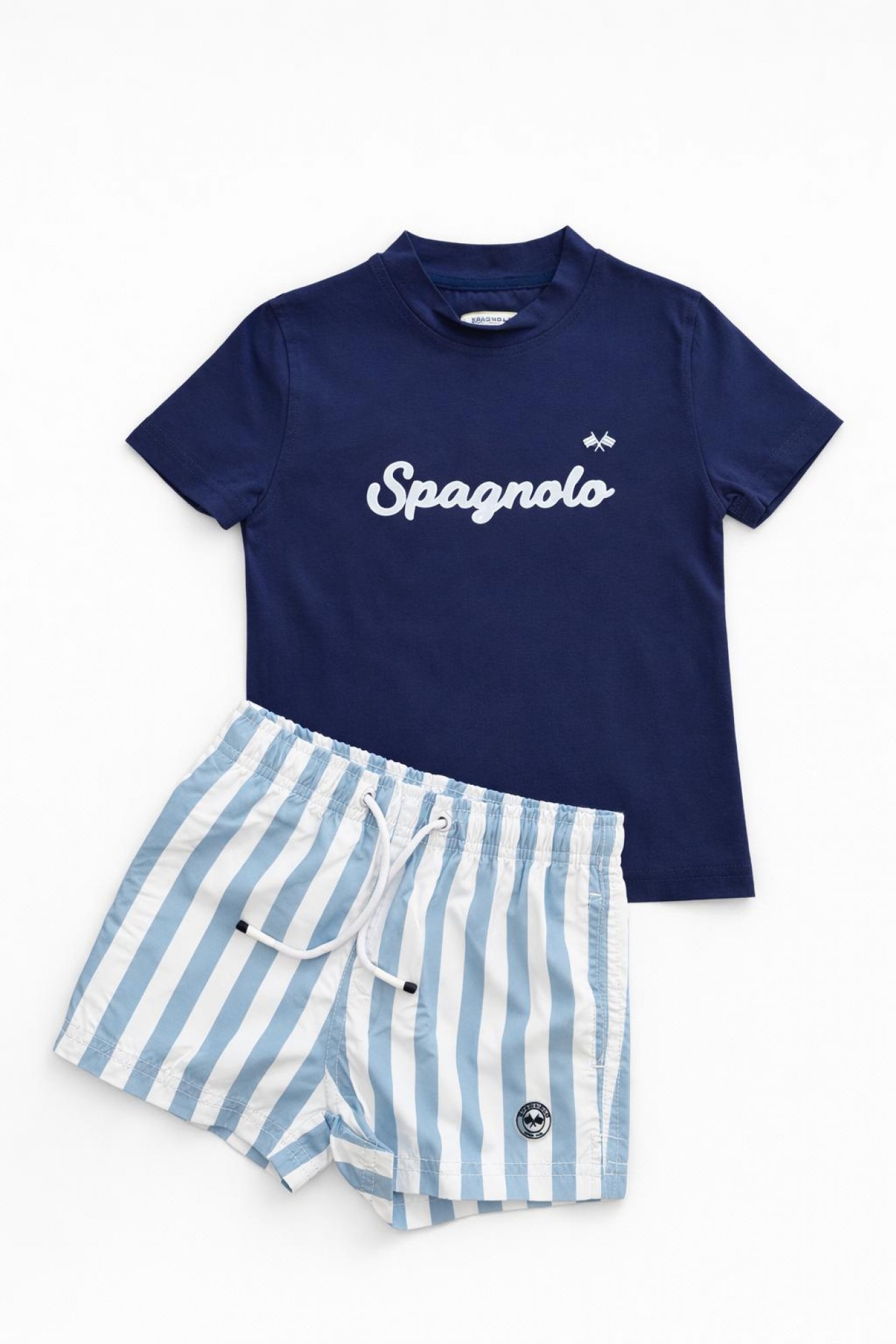 La camiseta está confeccionada en algodón suave en tono azul marino, con el nombre “Spagnolo” en blanco en el delantero y detalle de pequeñas banderas en el pecho. En la parte trasera destaca un estampado de banderas en tonos a juego con el bañador, aportando un toque original.