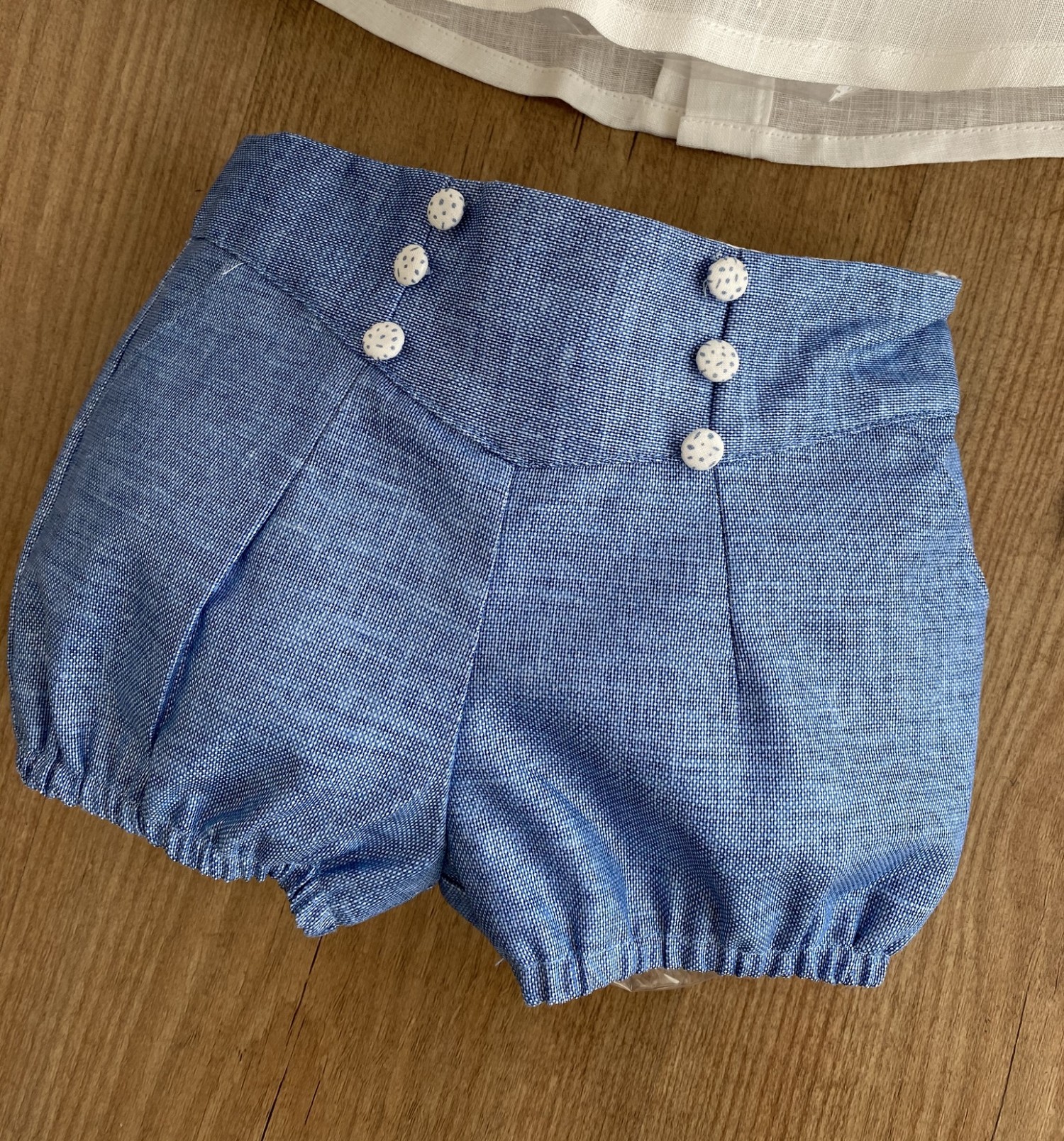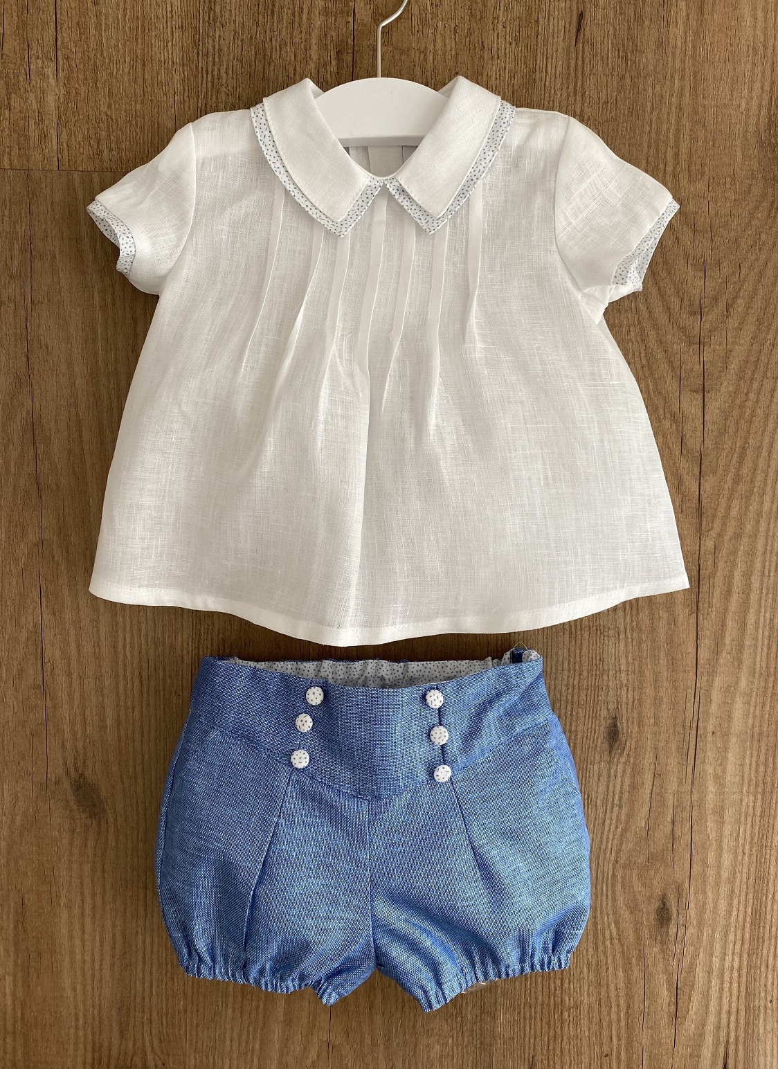 Conjunto de niño. Blusa y bombacho blanco y azul jeans