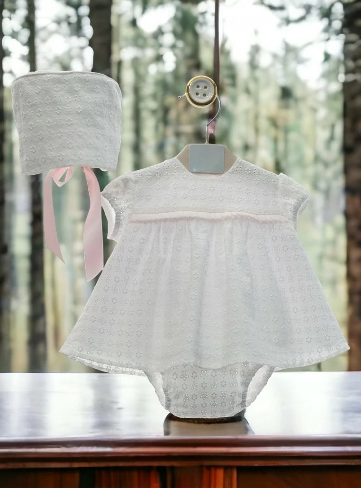 Confeccionado batista bordada en blanco con tablita y lazo rosa bebé