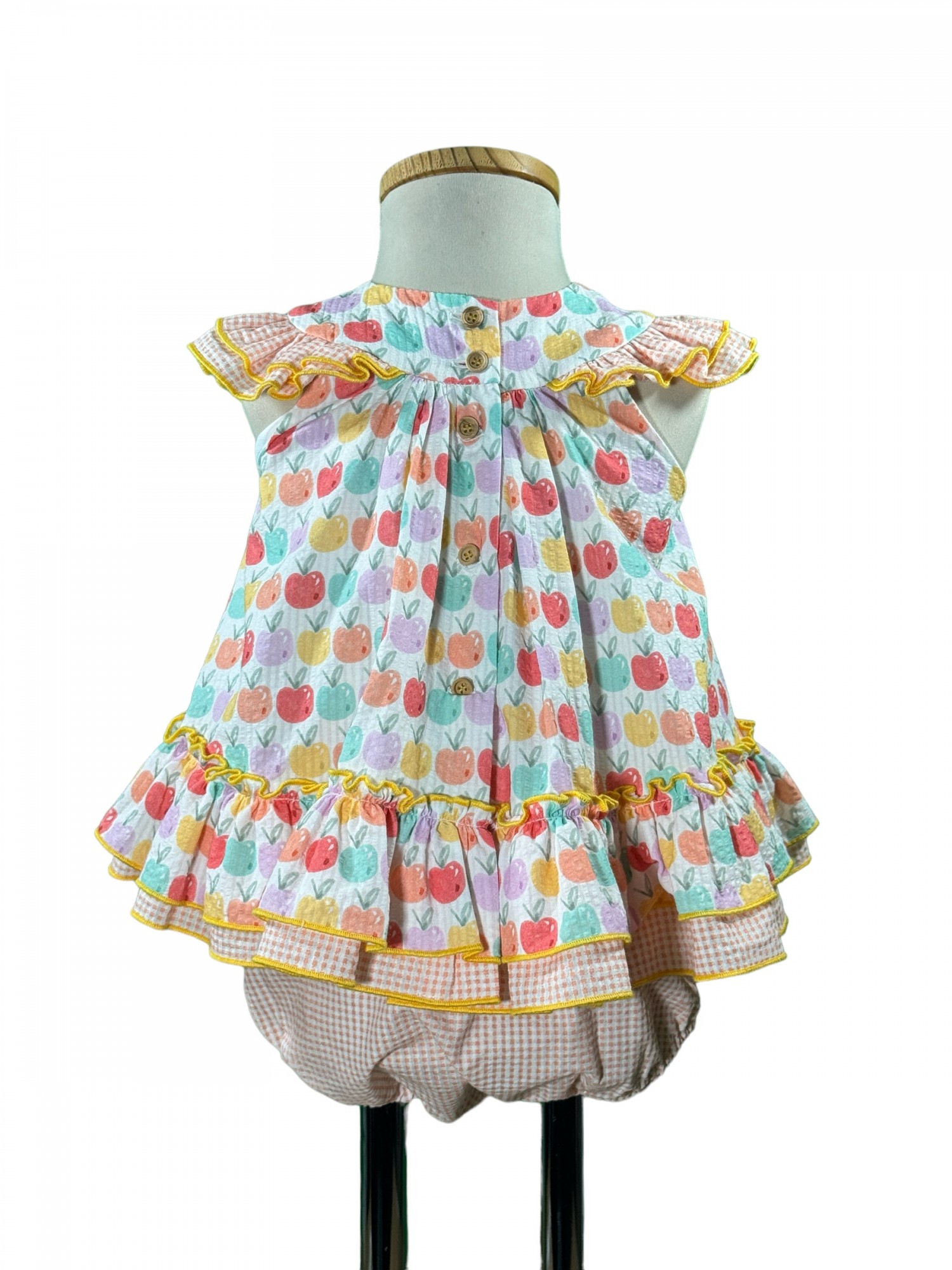 Jesusito de bambula con estampado manzanas de colores con volante en cuadrito Vichy, en bajo, mangas y braguita.