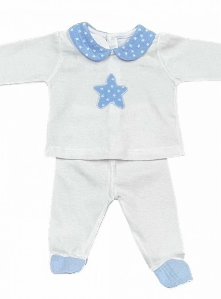 Confeccionado en algodón 100 x 100. Fondo blanco con cuellos bebé y estrella de muselina color rosa palo o azul.
