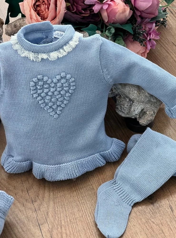 Jersey con capota y polaina confeccionado en punto finito en azul cielo o verde agua. Lleva en el centro un bonito corazón de bodoques. El cuello rematado con puntilla valenncie en beige.