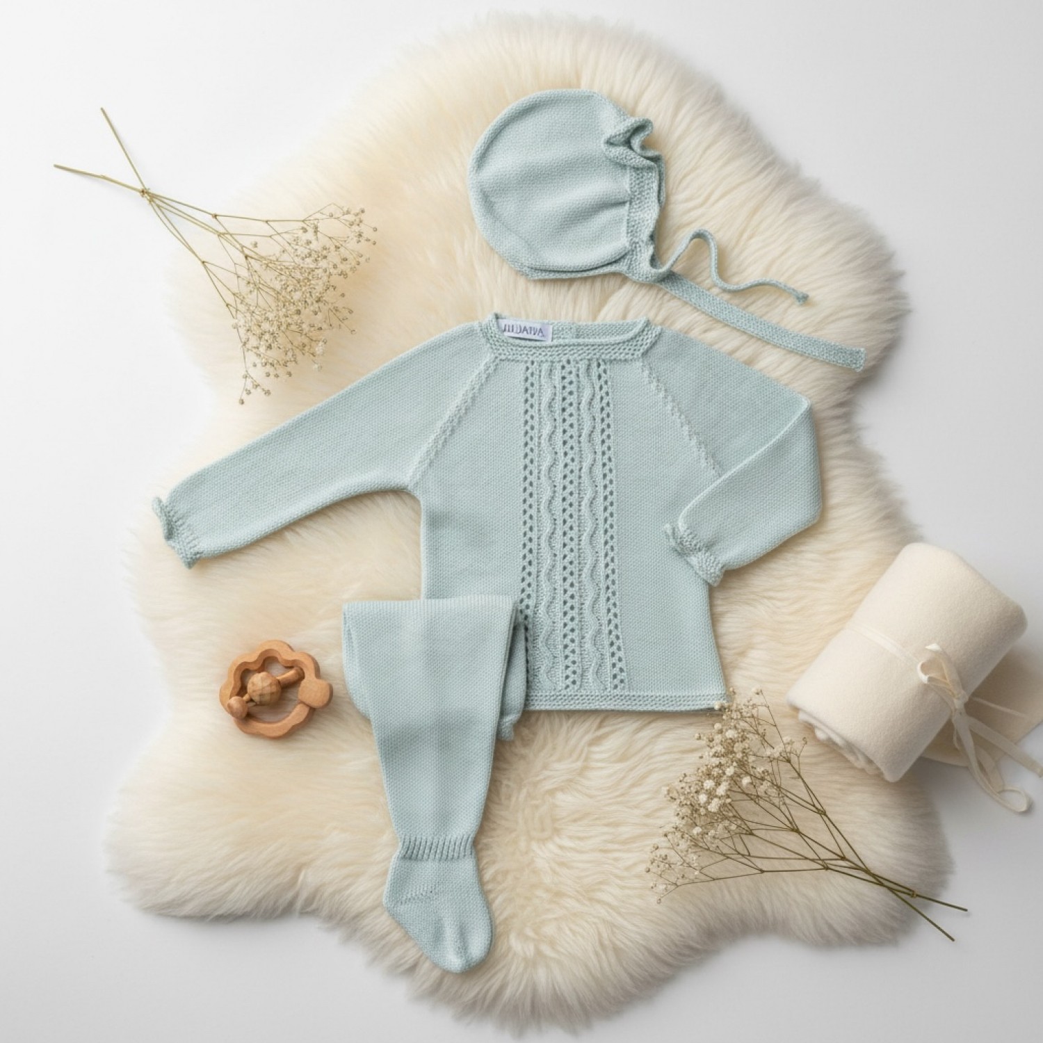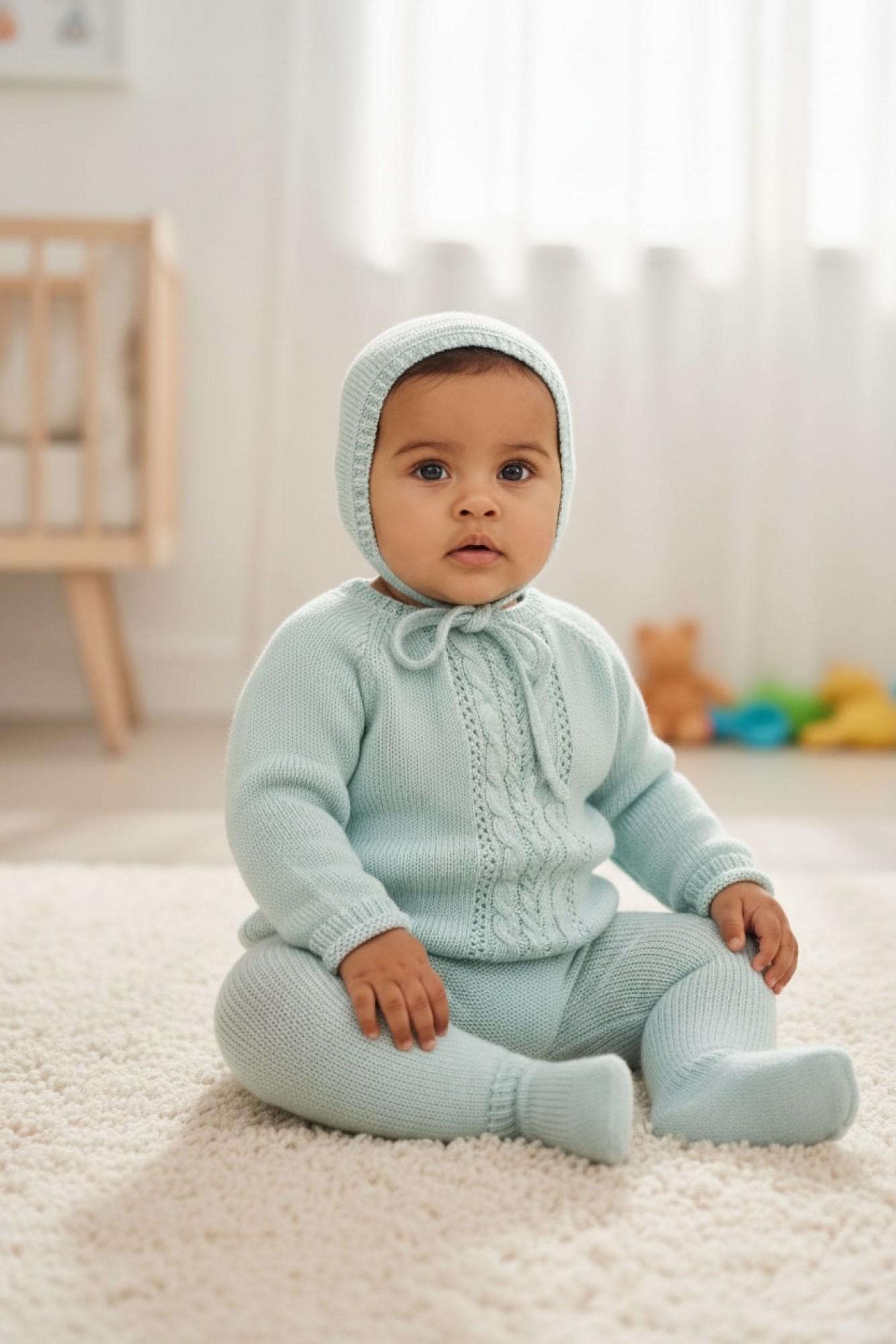 El jersey presenta un delicado diseño con detalle calado vertical en la parte central que estiliza y aporta un acabado muy elegante. El punto es fino, ligero y transpirable, perfecto para los días templados. La polaina a juego garantiza comodidad y ajuste suave, y la capota coordinada completa el conjunto con un aire clásico y cuidado.