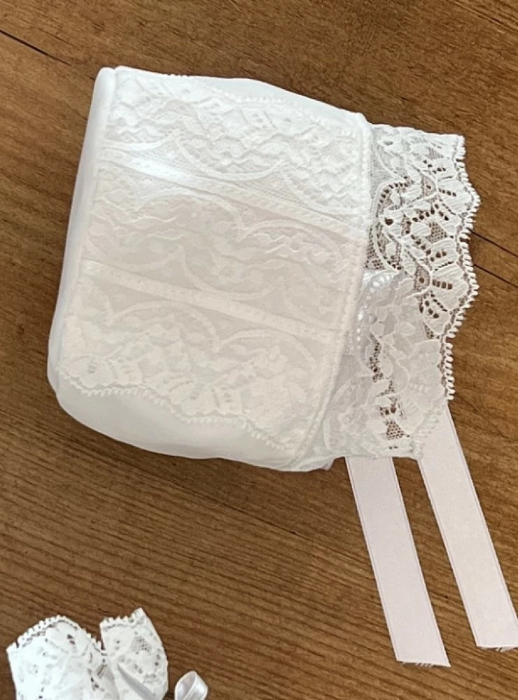 Confeccionado en organza blanca con puntilla valencie al tono y lazo de raso