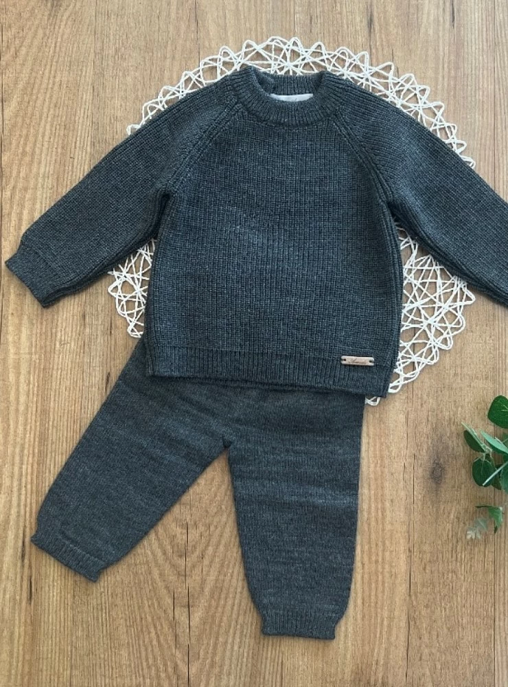 Jersey en punto inglés con dos botones de madera en la parte trasera para hacer mas cómoda su puesta y pantalón en punto lino. Dos colores. Marino y gris marengo.