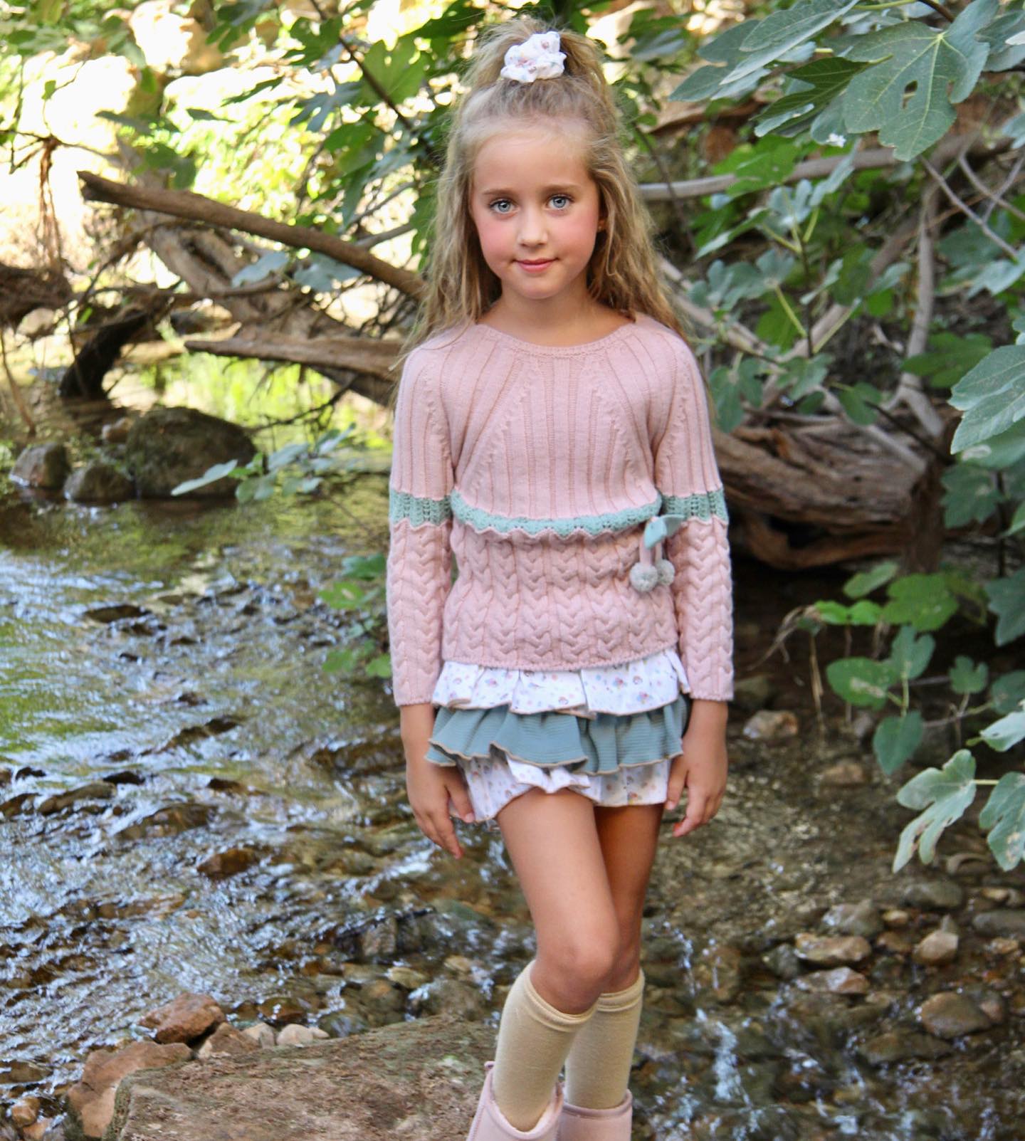 Dos piezas. Jersey en punto color rosa empolvado y verde con ochos y como detalle un bonito pompón. Lleva bombacho con volantes en tejido verde empolvado y estampado fiesta.