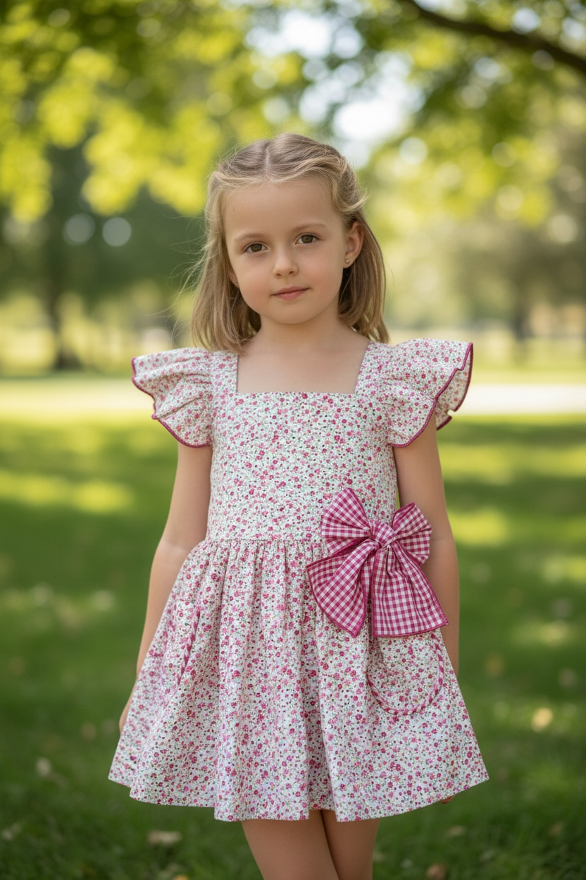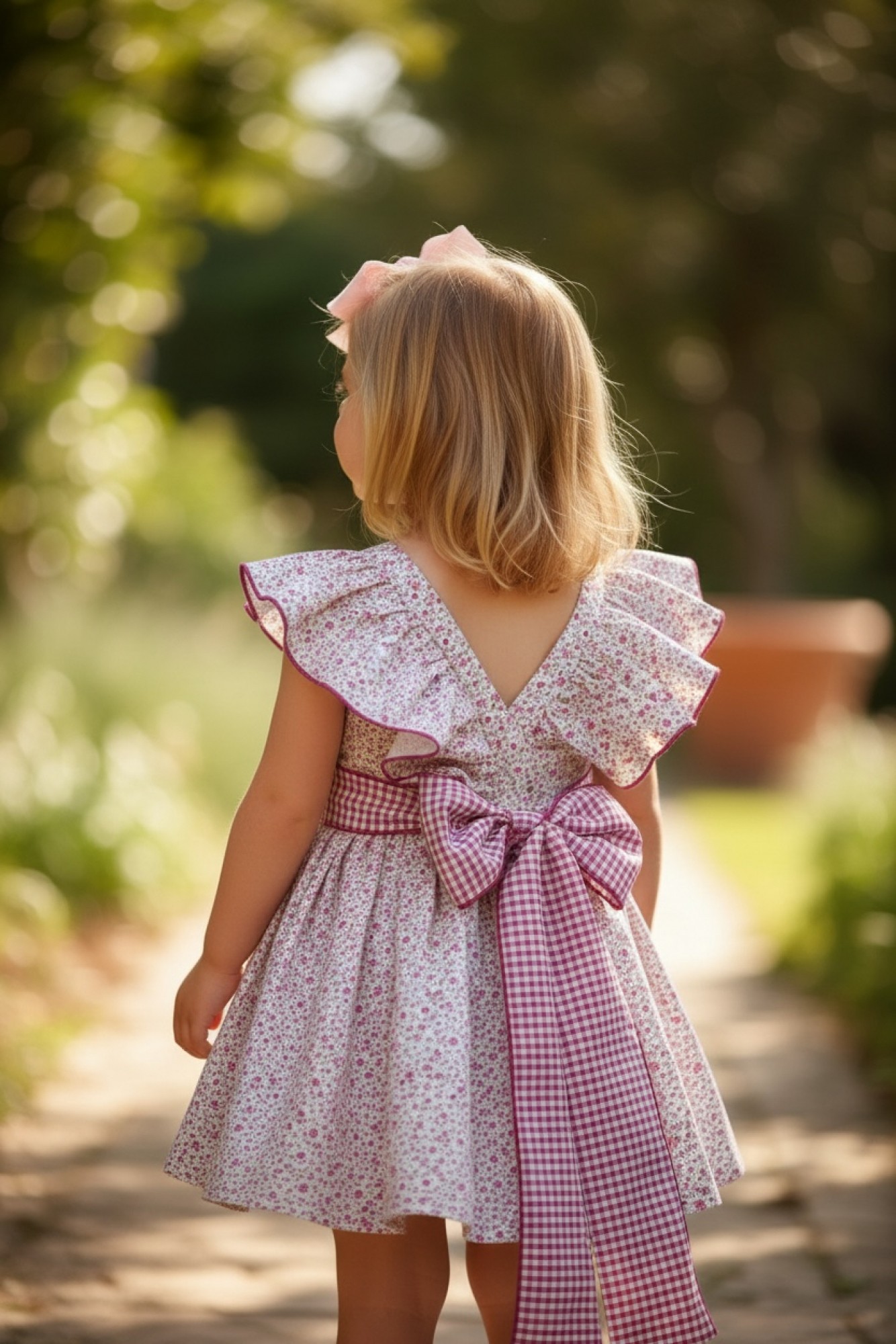 Destaca la lazada grande de vichy fucsia en la cintura, combinada con la braga a juego en el mismo vichy para un conjunto coordinado y precioso.
