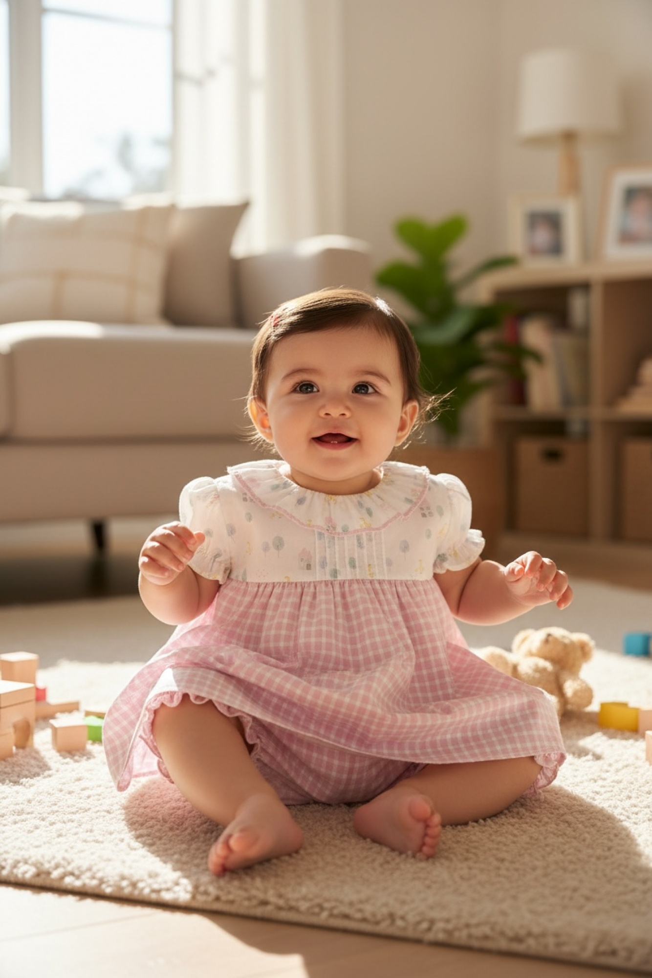 Jesusito rosa empolvado con cuadrito en crudo y cuerpo con un gracioso estampado bosque. Lleva cuello volante y manga farol. Braguita a juego.