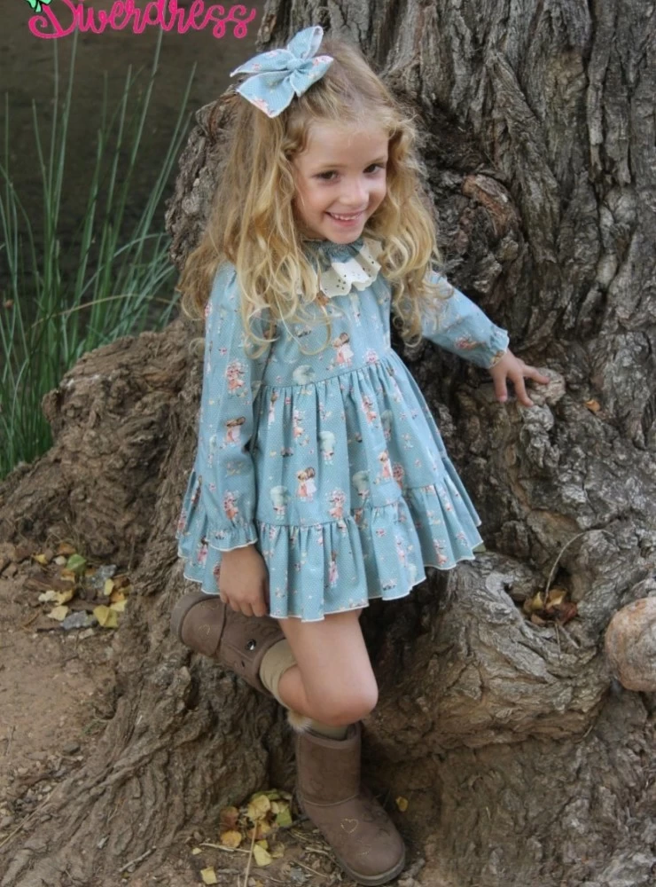 Confeccionado en un bonito tejido con fondo verde empolvado con topitos en crudo con estampado muñecas y flores. Lleva cuello fruncido con puntilla de bolillos.