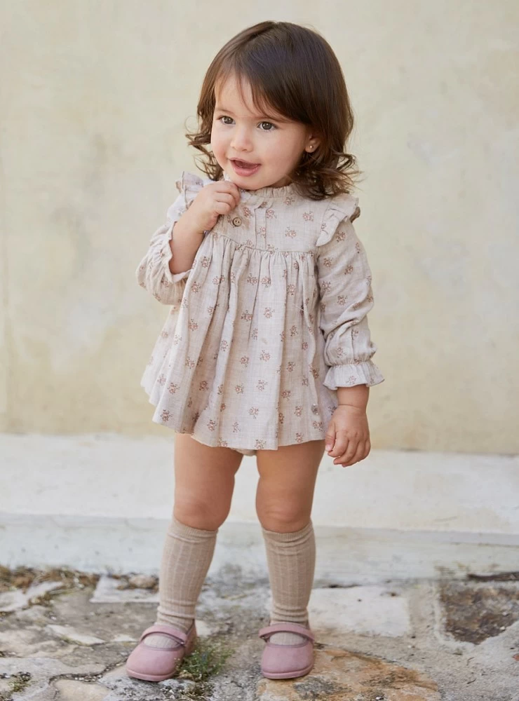Confeccionado en muselina color arena con flores color rosa empolvado. Es muy fino y bonito