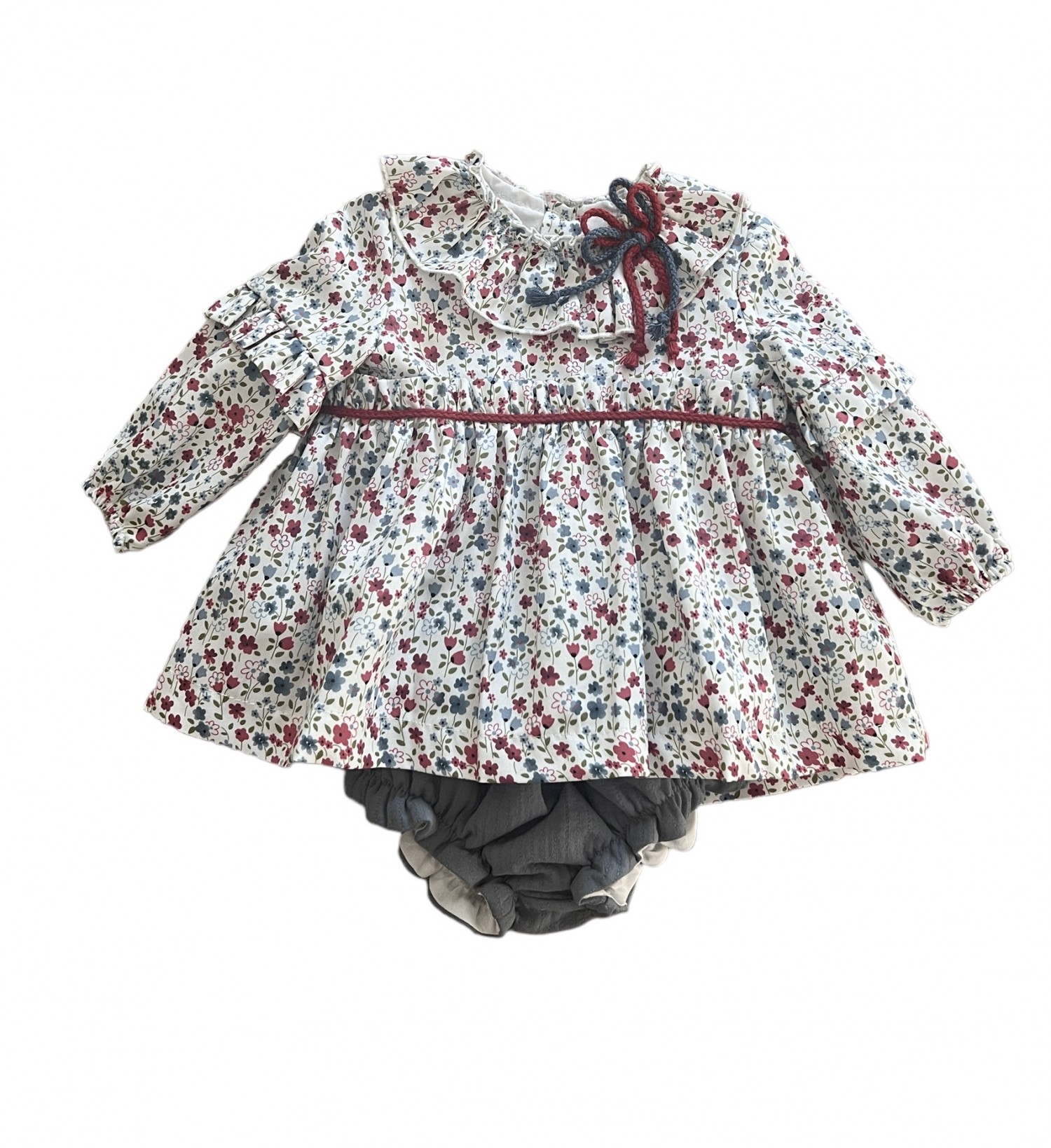 Jesusito de viella blanca con florecitas en azul o burdeos. Lleva cuello volante. Braga en azul empolvado.