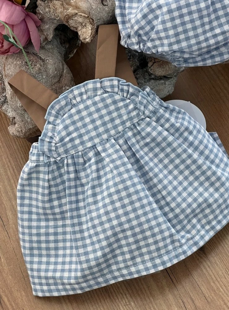Confeccionado en popelín de algodón 100 x 100 con vichy azul y blanco. Lazo del hombro color marrón.