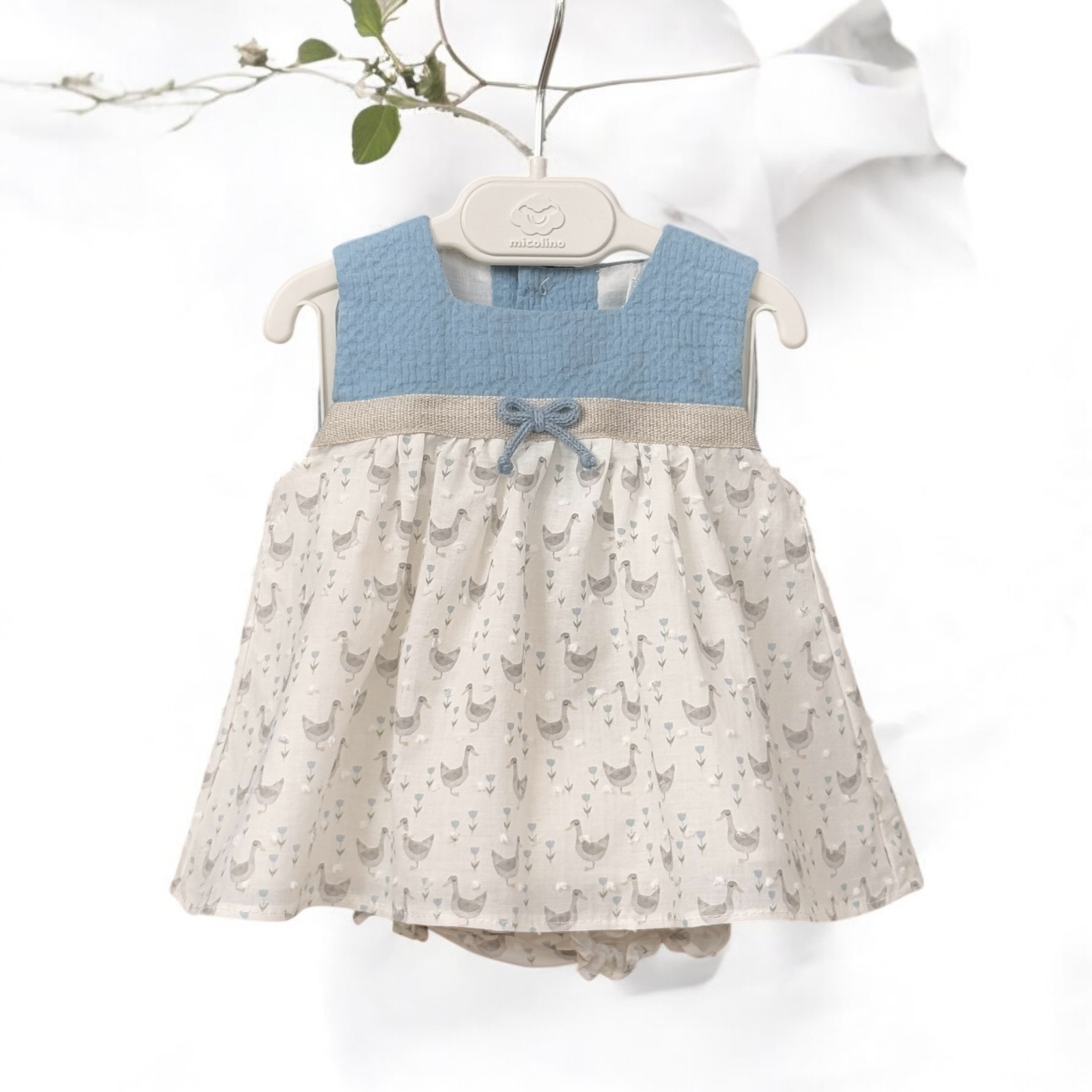 Combina dos tipos de tejido, plumeti y piqué. Pique azul empolvado y plumeti con un bonito estampado patos en tonos gris