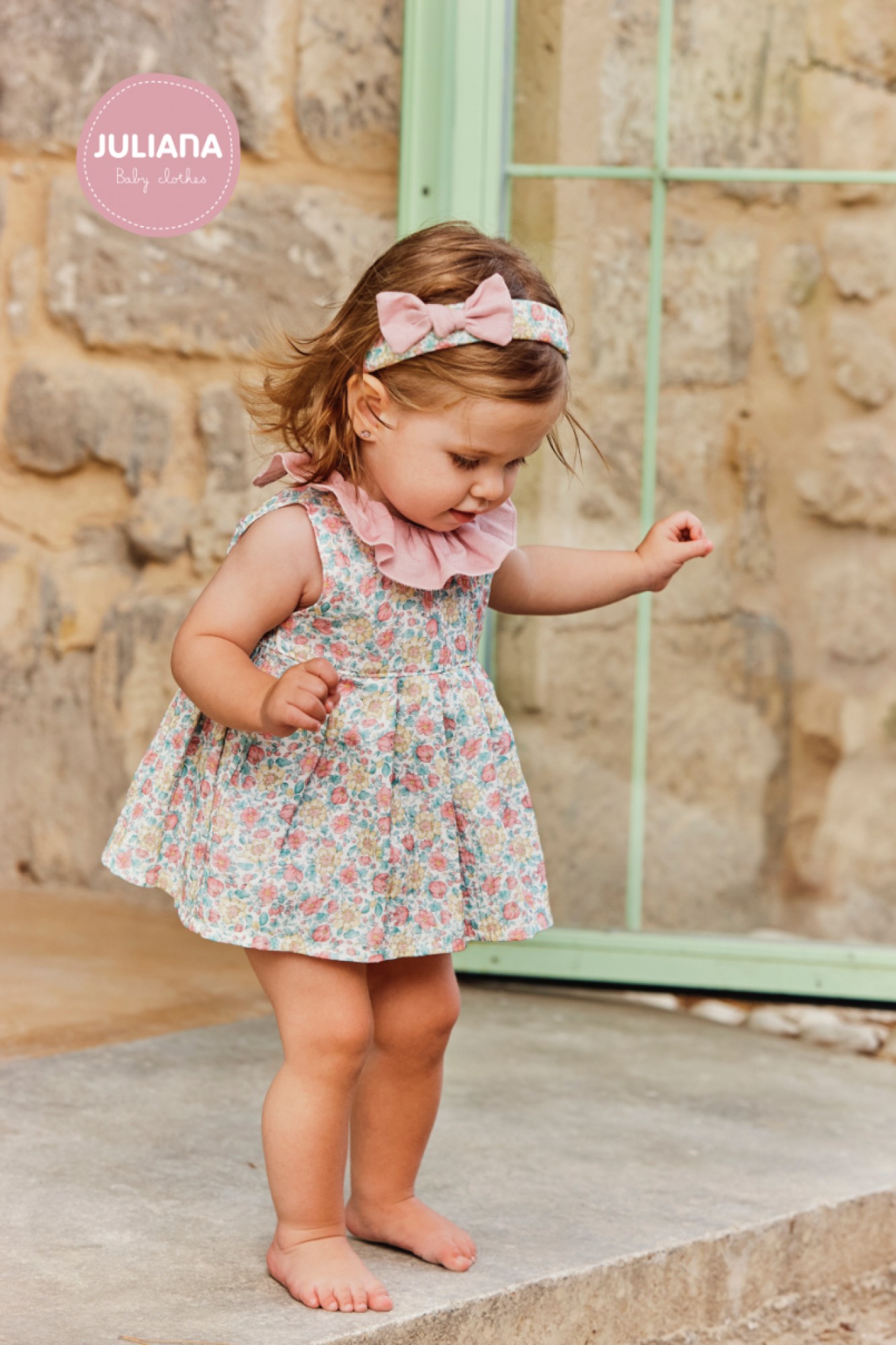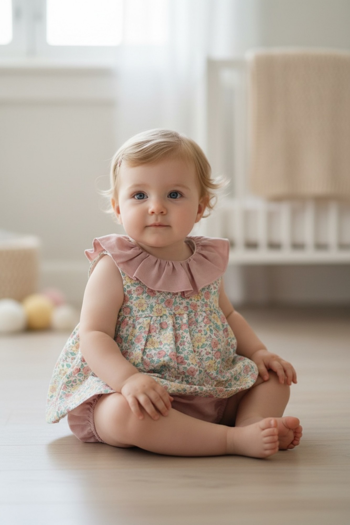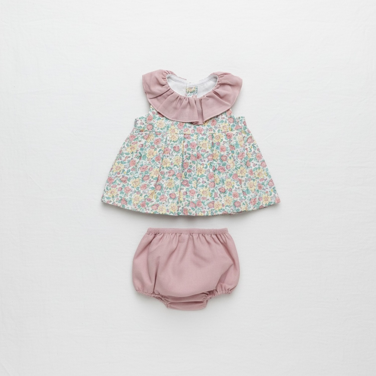 Conjunto de jesusito en muselina estampada con delicado dibujo floral en tonos rosa, verde y amarillo sobre fondo claro.