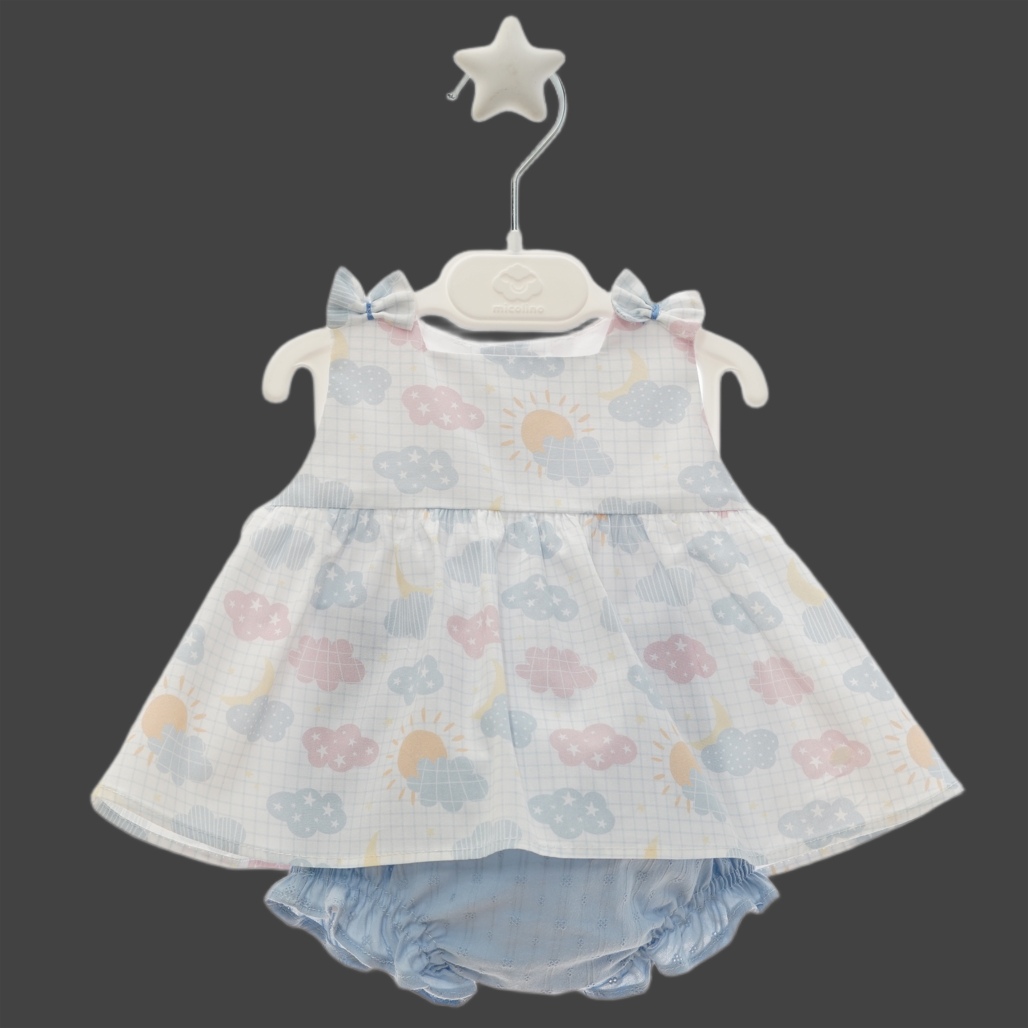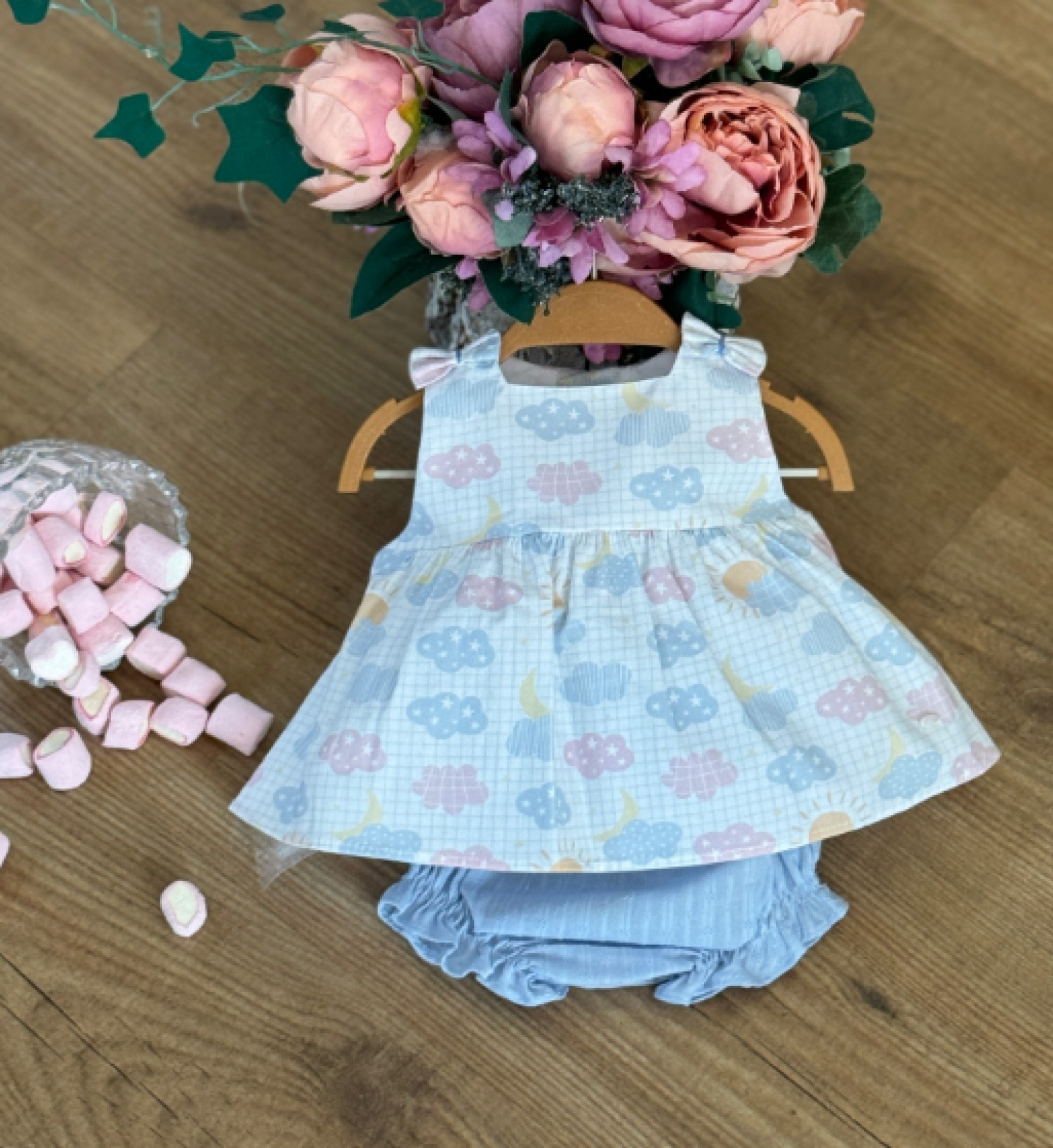 Jesusito confeccionado en estampado nubes y soles con braguita de muselina azul empolvado.