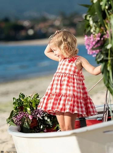 Confeccionado en popelín estampado amapolas. Es cruzado por delante y remata con tabla vichy a juego con la braga. Lleva 4 botones como detalle en rojo.