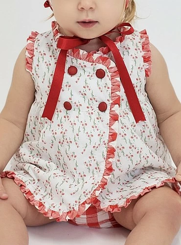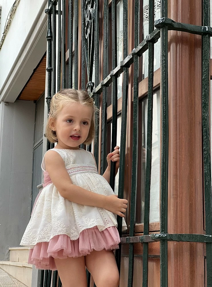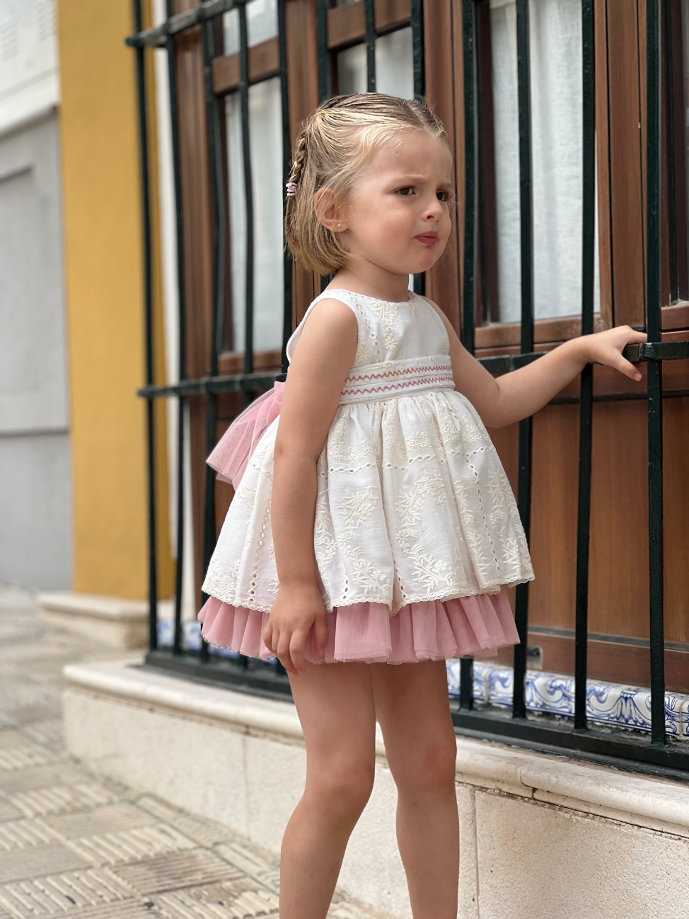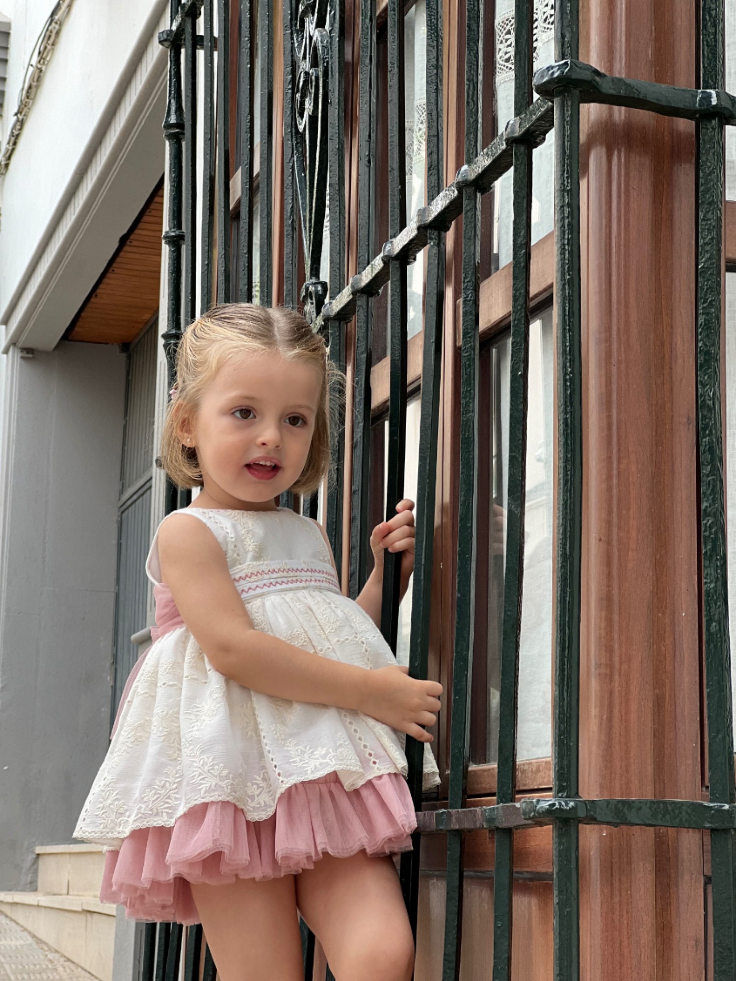 Confeccionado en batista bordado en tono beige con tul en rosa empolvado. Es ideal para bautizo o ceremonia