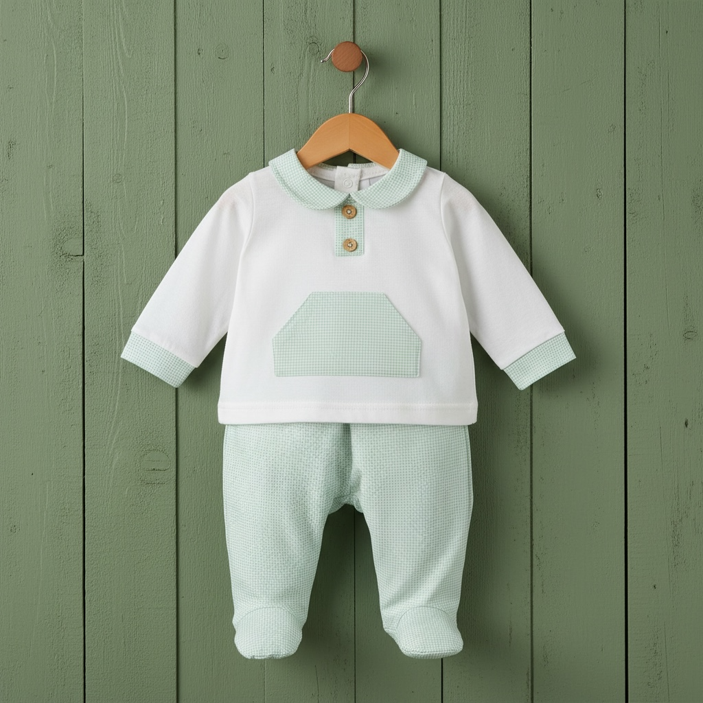 Camisetita blanca de manga larga con cuello bebé en vichy verde agua, con un acabado dulce y clásico.