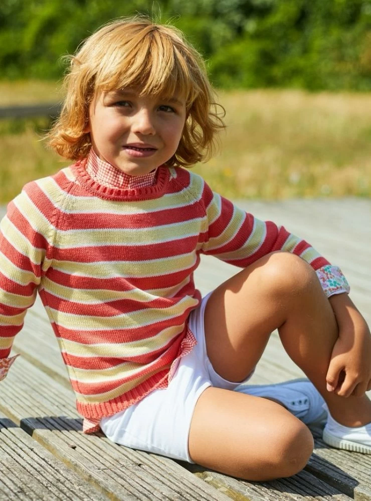 Camisa con cuadrito vichy naranja y blanco. Pantalón corto de loneta blanco y jersey de rayas en mandarina y amarillo.