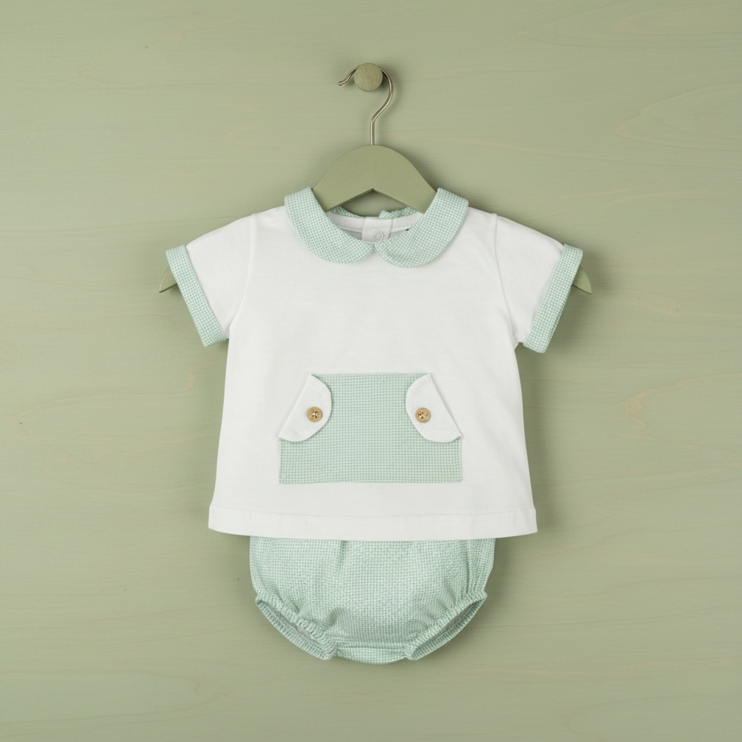 Camisetita blanca con cuello bebé y remates en vichy verde agua, con un acabado dulce y clásico.