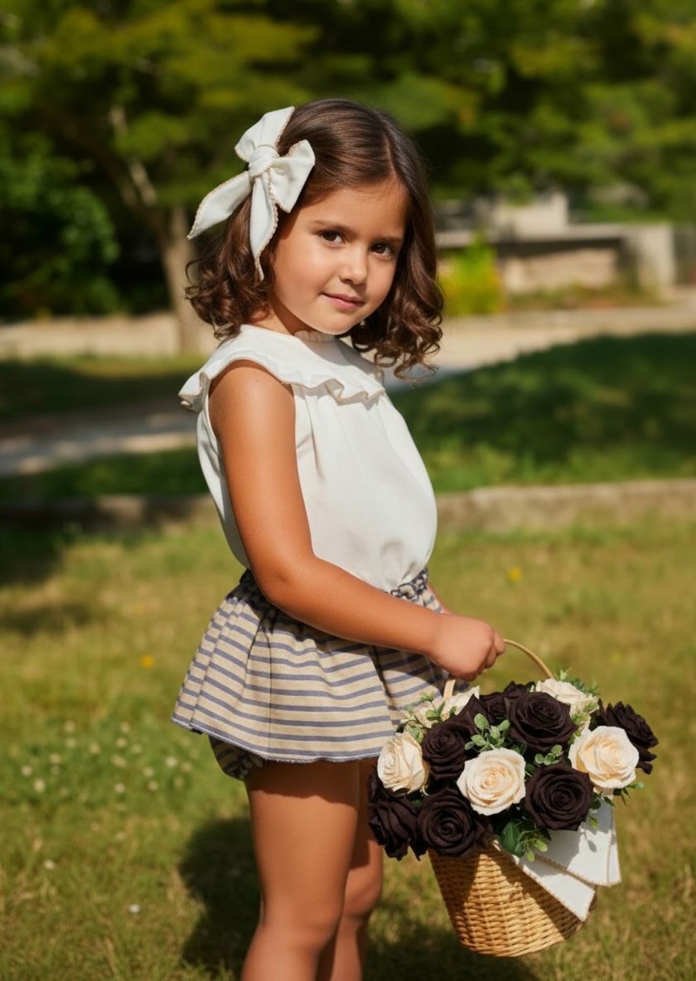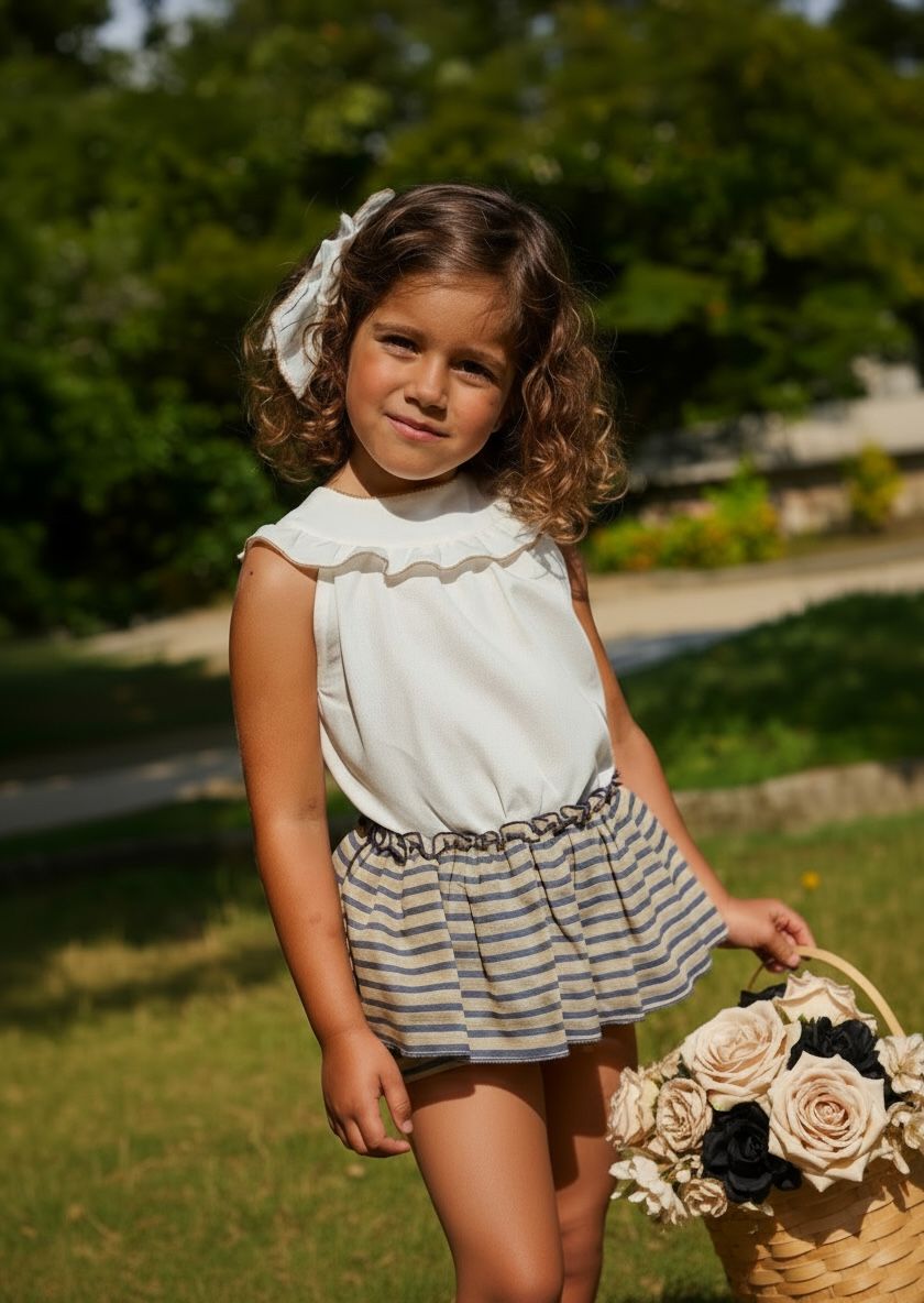 Conjunto de niña compuesto por blusa de lino y braga falda en tonos neutros, con un estilo elegante y muy veraniego.