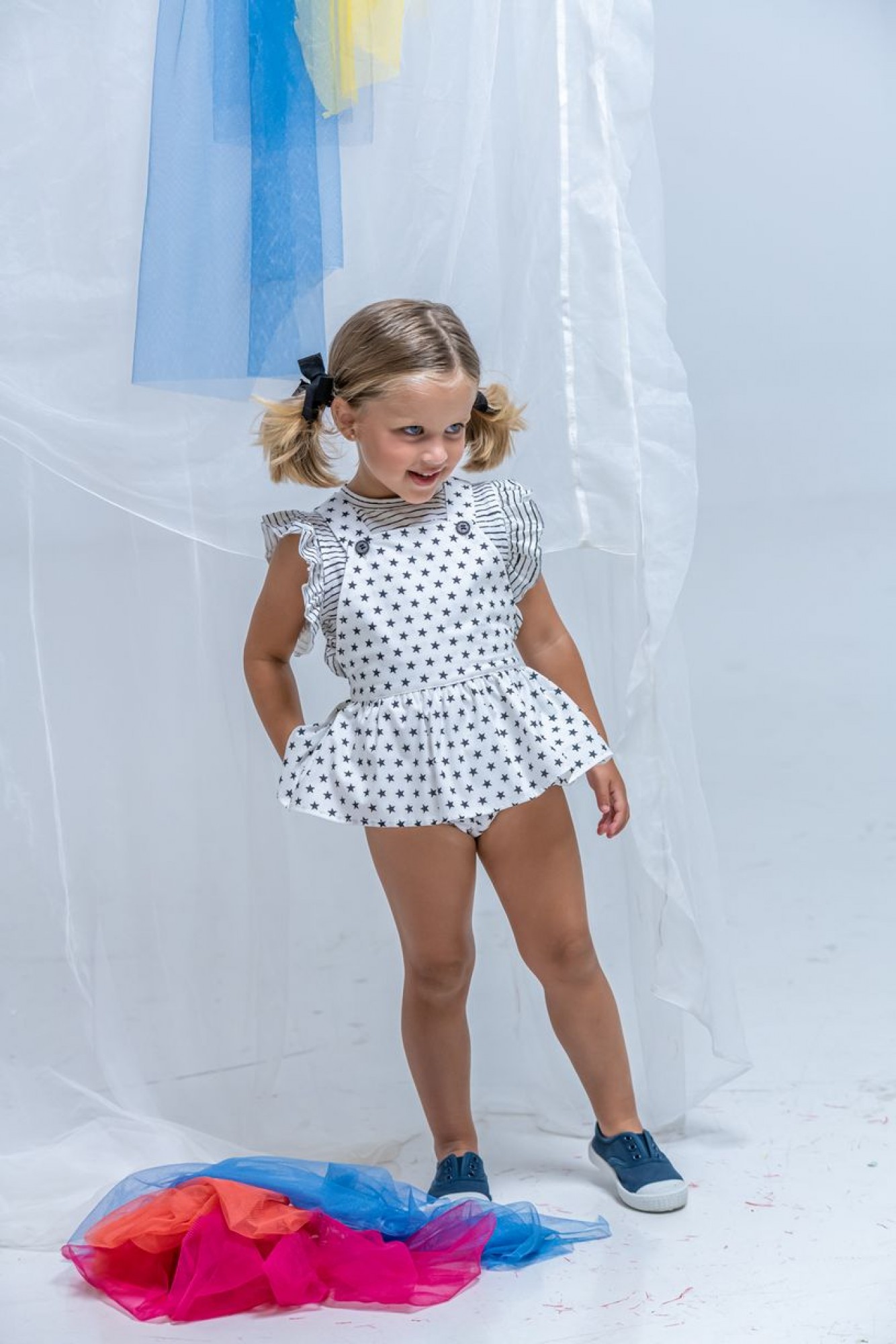 Camiseta de algodón a rayas en blanco y negro, lleva cuello redondo y manga mariposa. Ranita de estrellas en popelín blanco y negro. Muy Original par usar junto o separado.