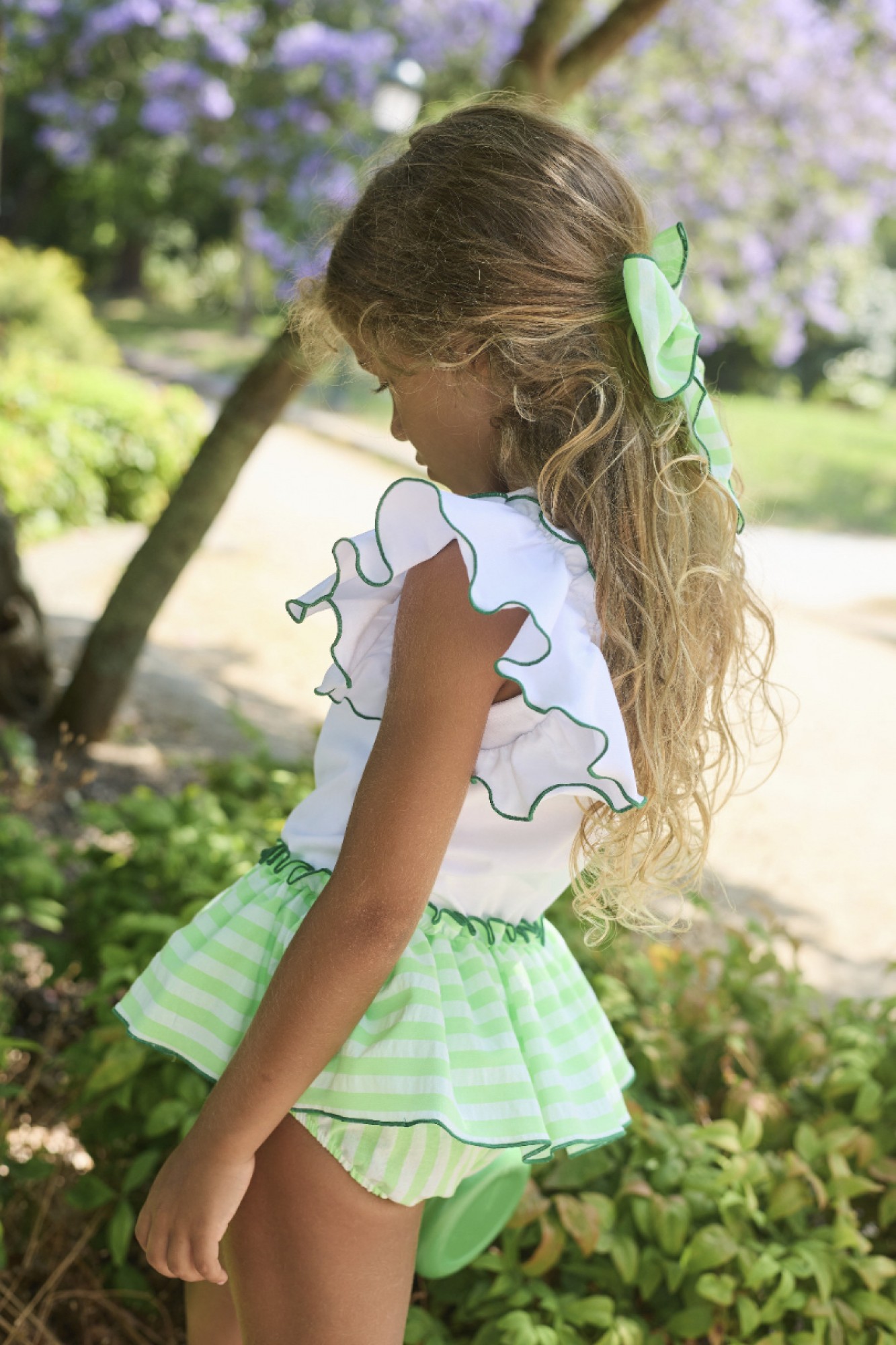 Conjunto compuesto por camiseta blanca y braga falda en tejido ligero con estampado de rayas horizontales en verde manzana y blanco.