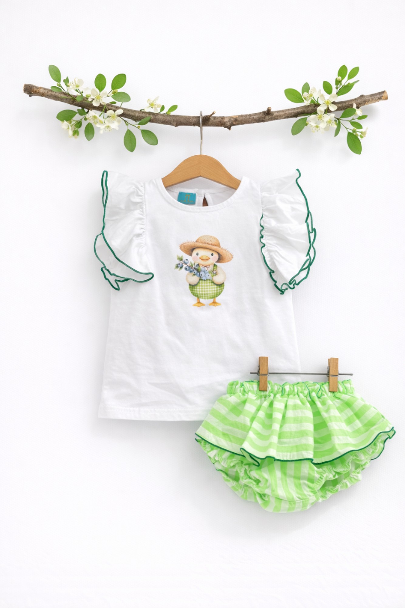 La camiseta es lisa en color blanco y destaca por sus mangas con volante amplio, rematadas con vivo ondulado en verde oscuro que enmarca el contorno. En la parte central incorpora un dibujo infantil: un pequeño patito vestido con peto verde de cuadro vichy y sombrero de paja, sosteniendo un ramo de flores en tonos azulados. El diseño está impreso con acabado suave, integrado en la prenda.
