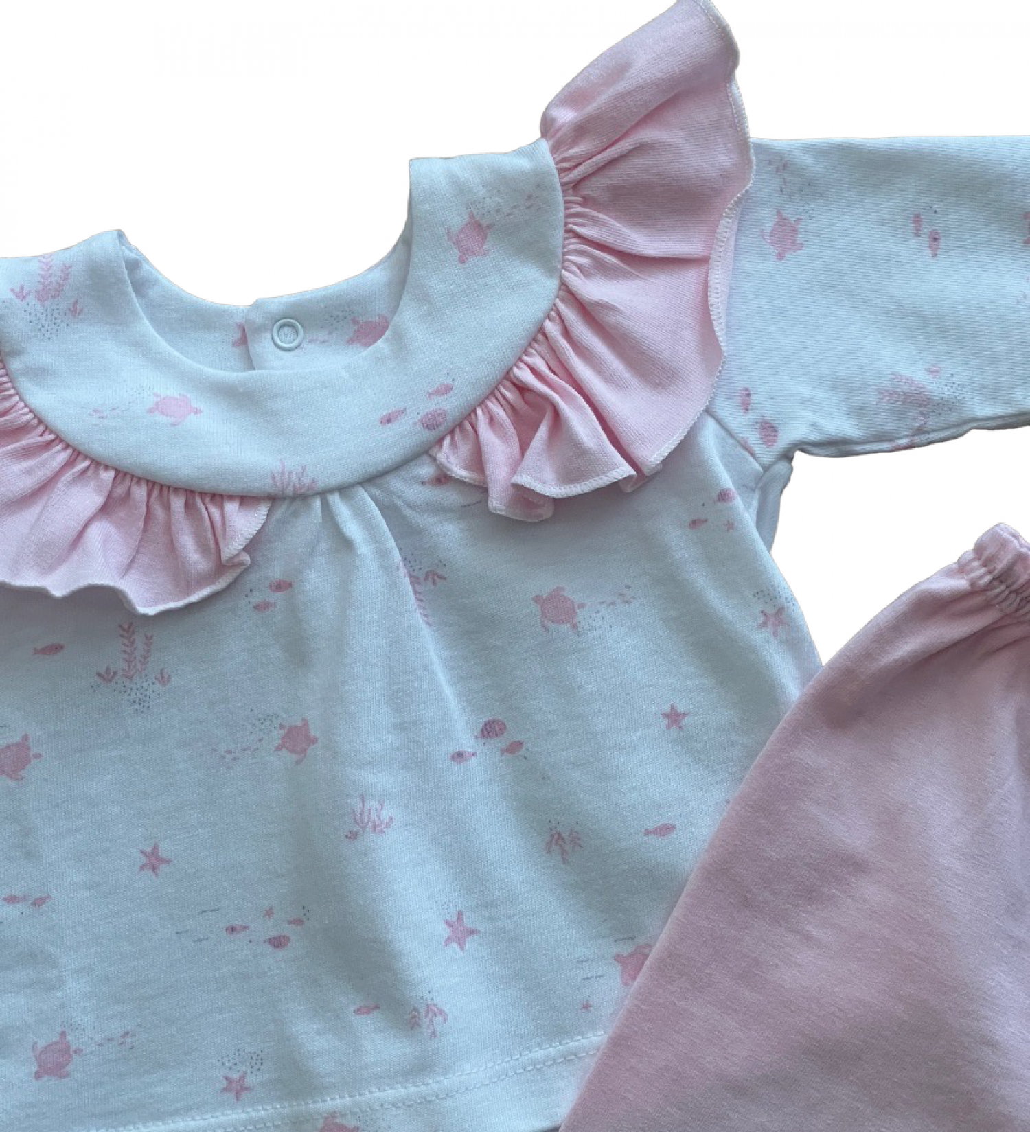 Confeccionado en fondo blanco con estampado tortugas y cuello volante en rosa.