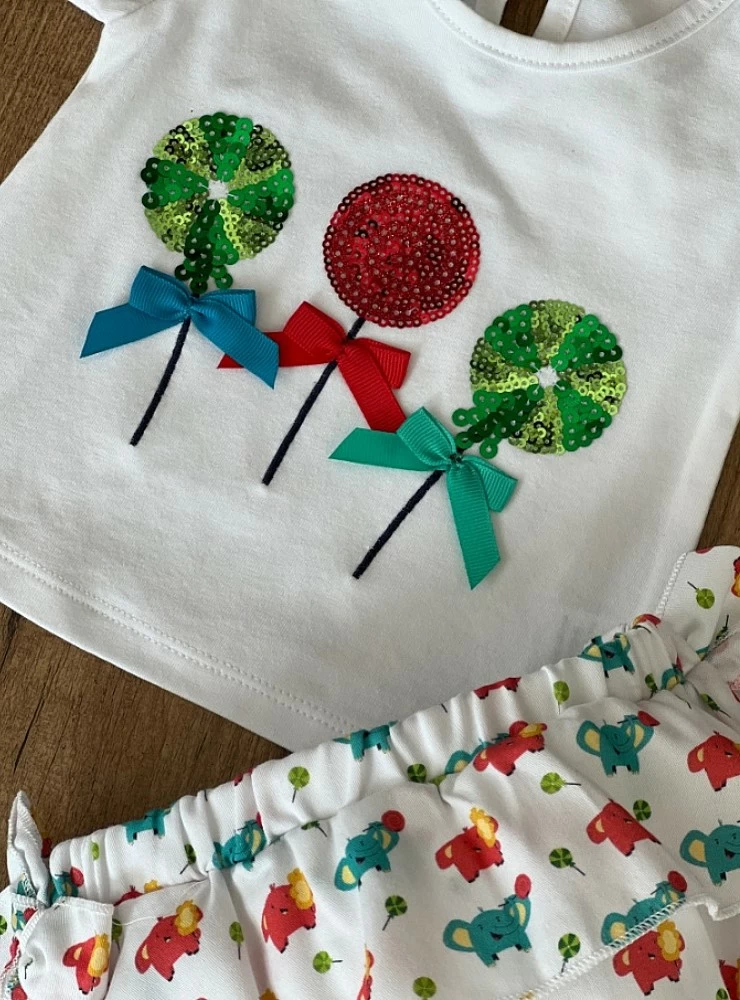 Camiseta blanca con estampado piruletas y braguita con volantes