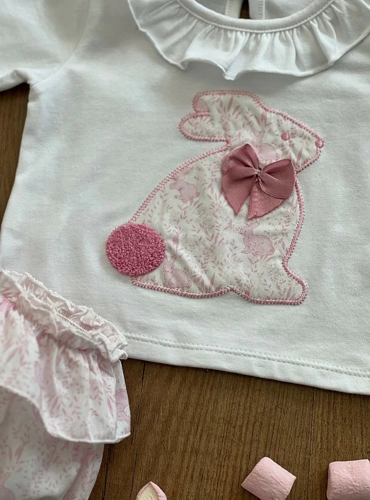Camiseta en algodón blanco con estampado rabbit en rosa chulisimo y braguita a juego.