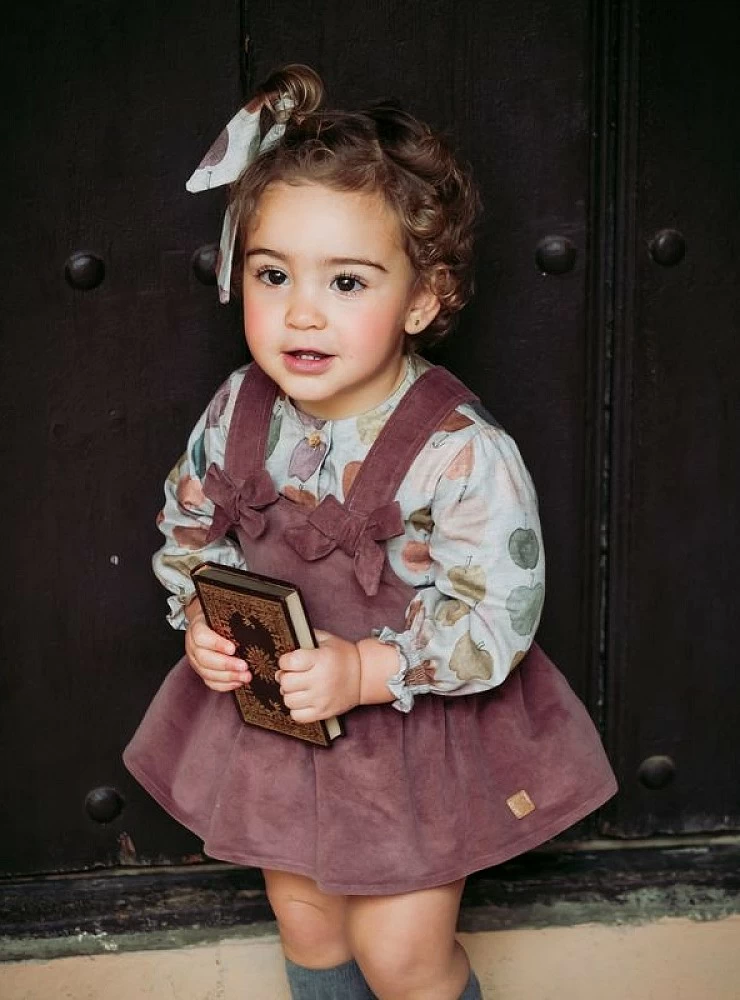 Ranita de panita fina color uva ( burdeos empolvado) con tirantes y lazo, lleva blusa de viella con estampado manzanas con cuello grande desmontable.
