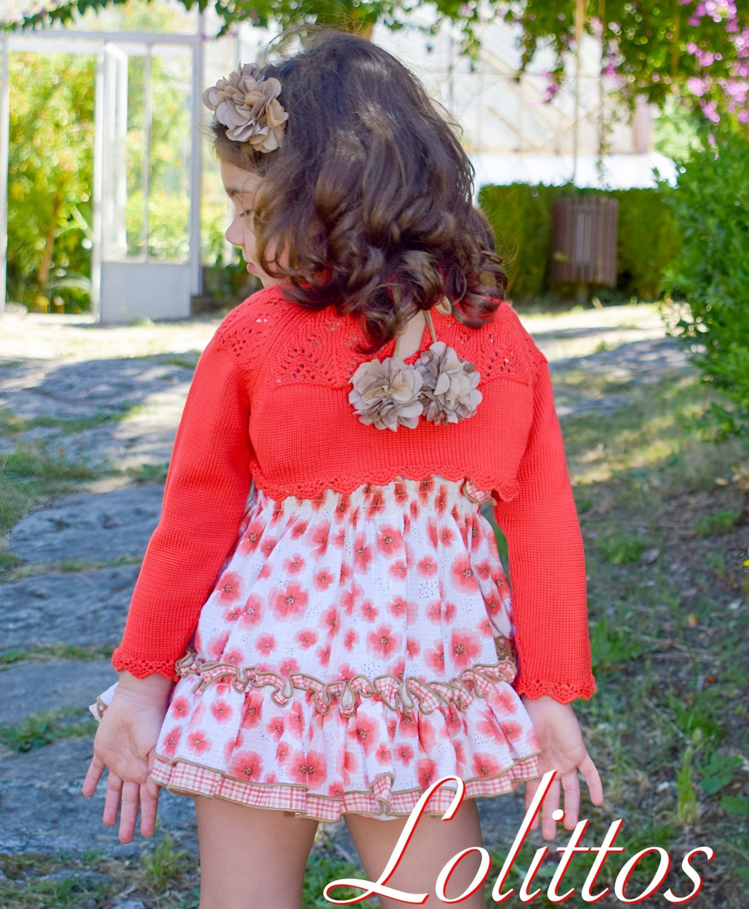 Jesusito y braga en tejido de bambula con estampado amapolas rojas y combina con cuadrito vichy. Cuerpo engomado con manga volantes y flor de tul marrón como detalle y con jersey corto en punto de verano rojo con espalda maravillosa