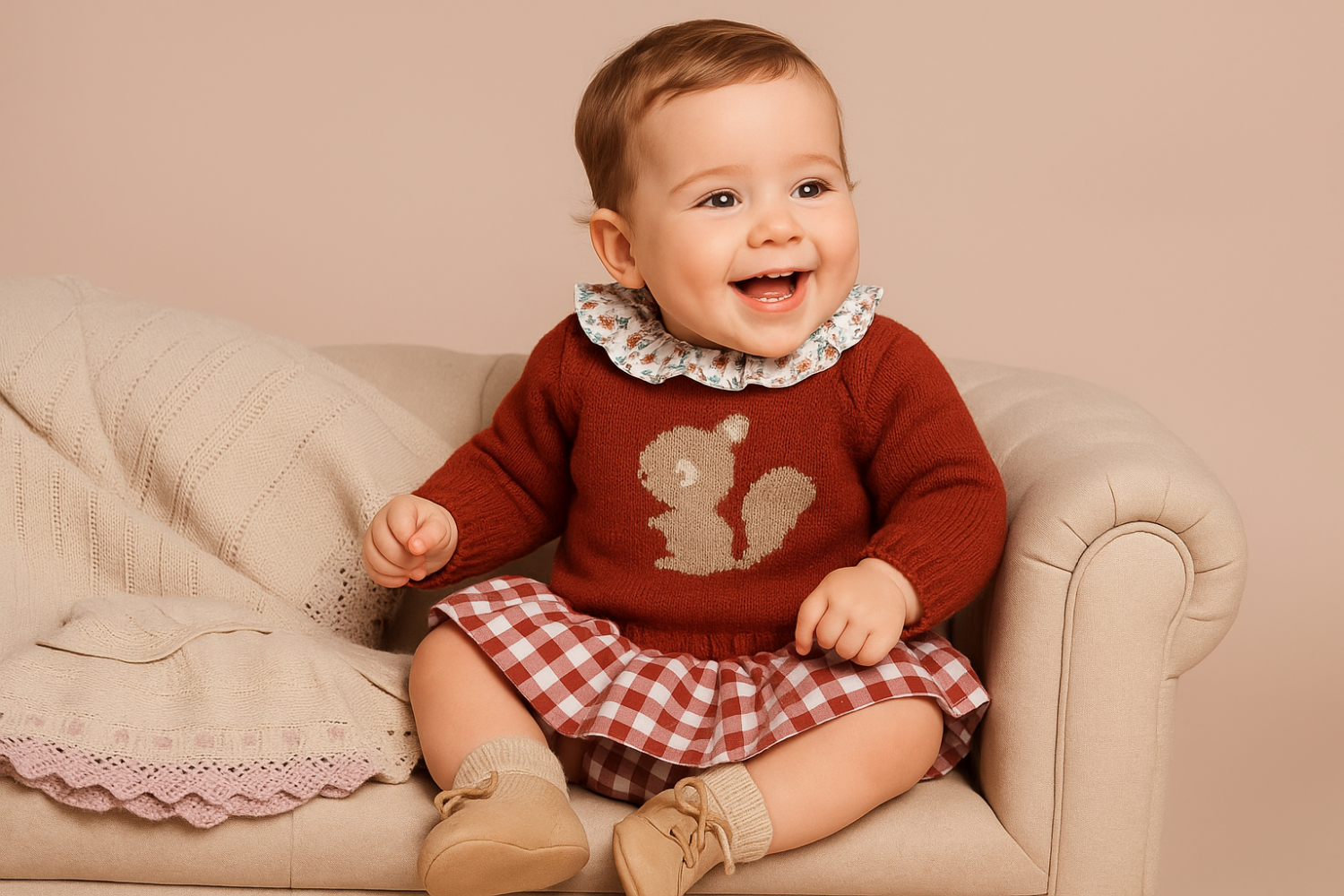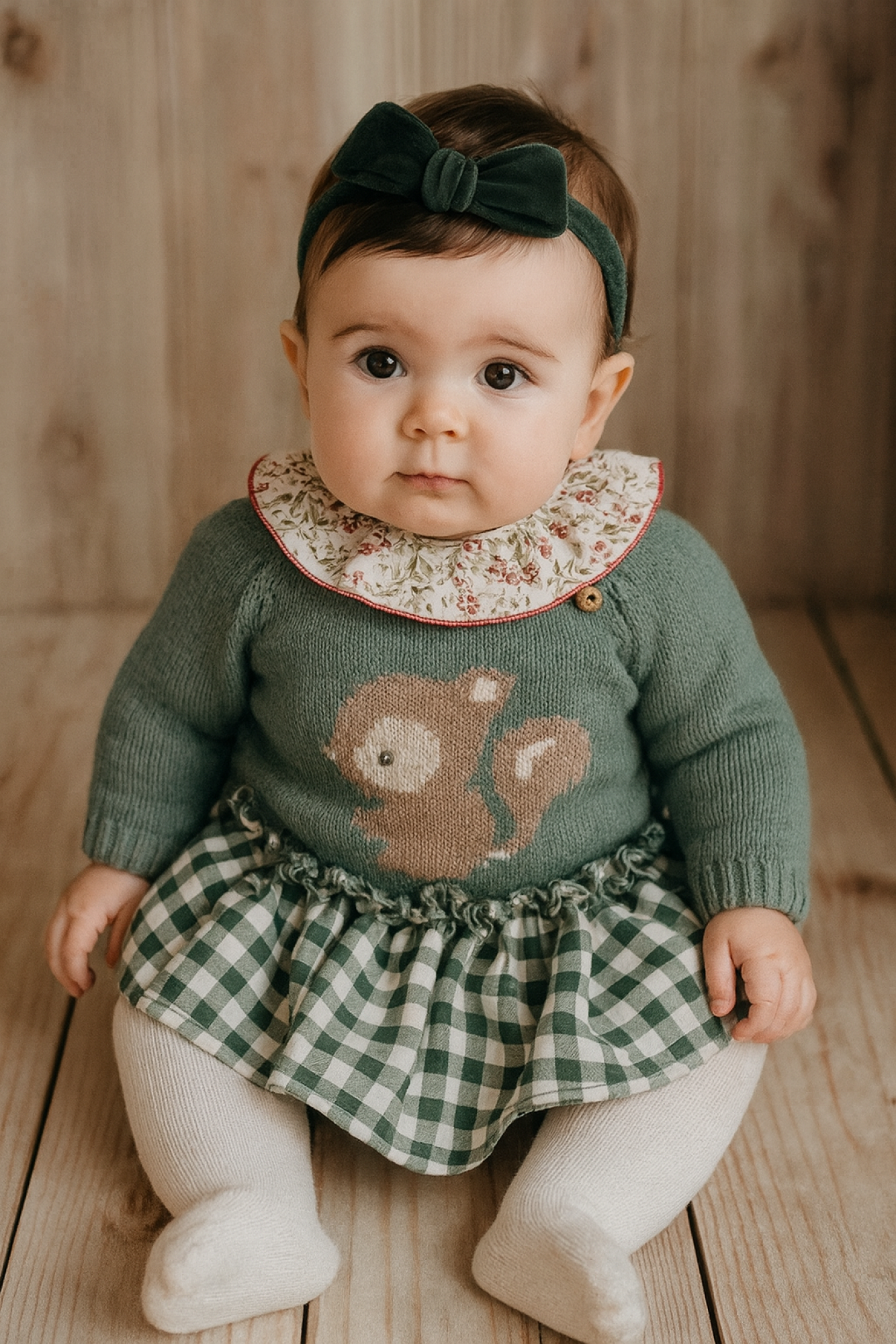 Compuesto por jersey en verde o calabaza, lleva blusa con flores estampadas y cuello volante, con braguita con volantes en vichy al tono