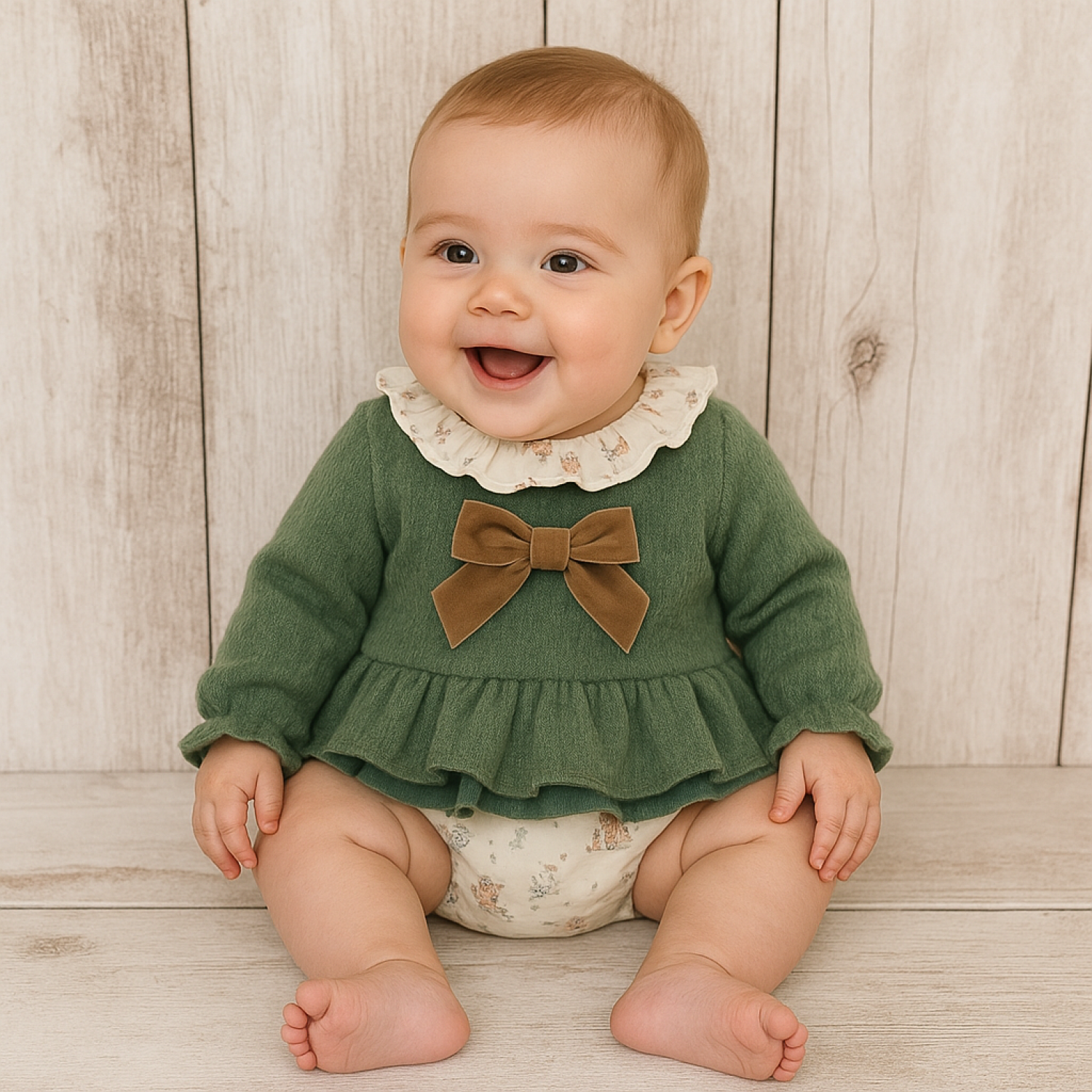 Jersey en punto con volante en el bajo. lleva cuello de viella estampado y lazo de terciopelo en color arena, la braga con volante de viella combinando tejido estampado con rayas.