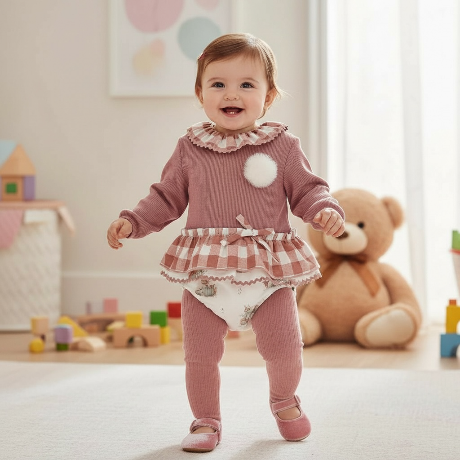 Jersey en punto de algodon color rosa viejo con cuello volante de vichy y pompón de pelo como detalle, la braguita es con volante en viella estampada con ardillas muy originales y picunela al tono