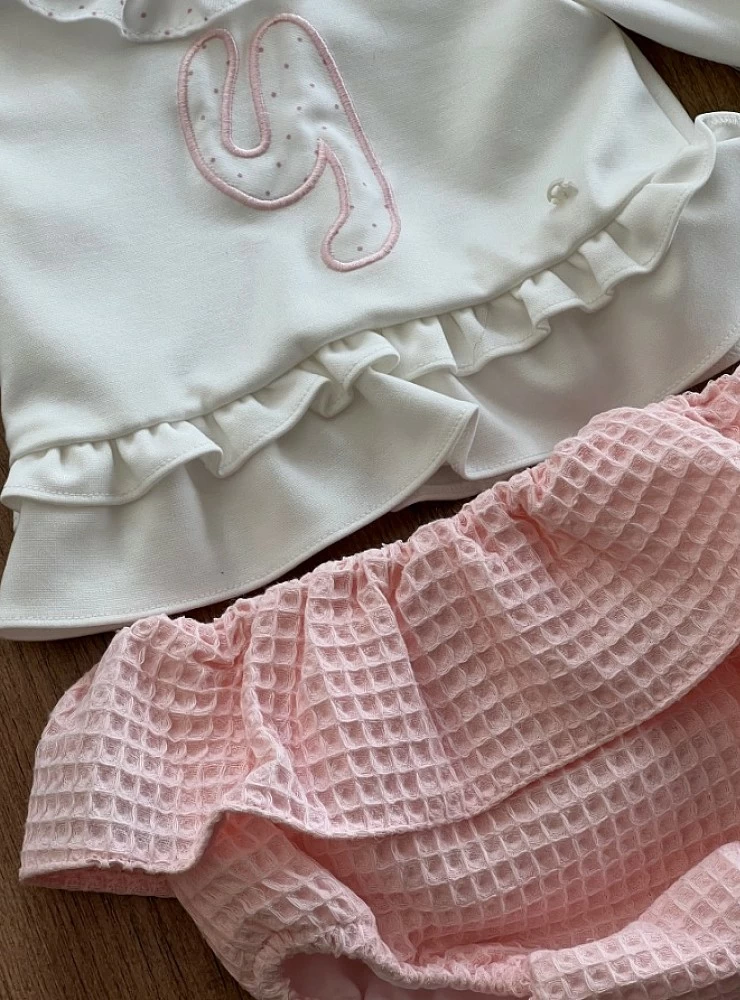 Sudadera y braguita: La sudadera es de algodón beige con una bonita Y bordada y rellena de topos rosa a juego con el cuello volantes.