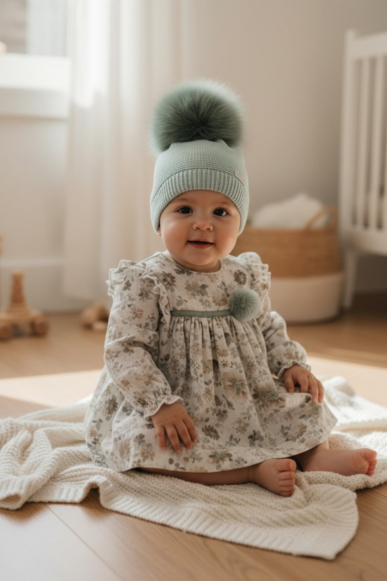 Confeccionado en muselina empolvada con estampado fondo crudo y flores en tonos verde y gris. Lleva pompon de pelo color verde.