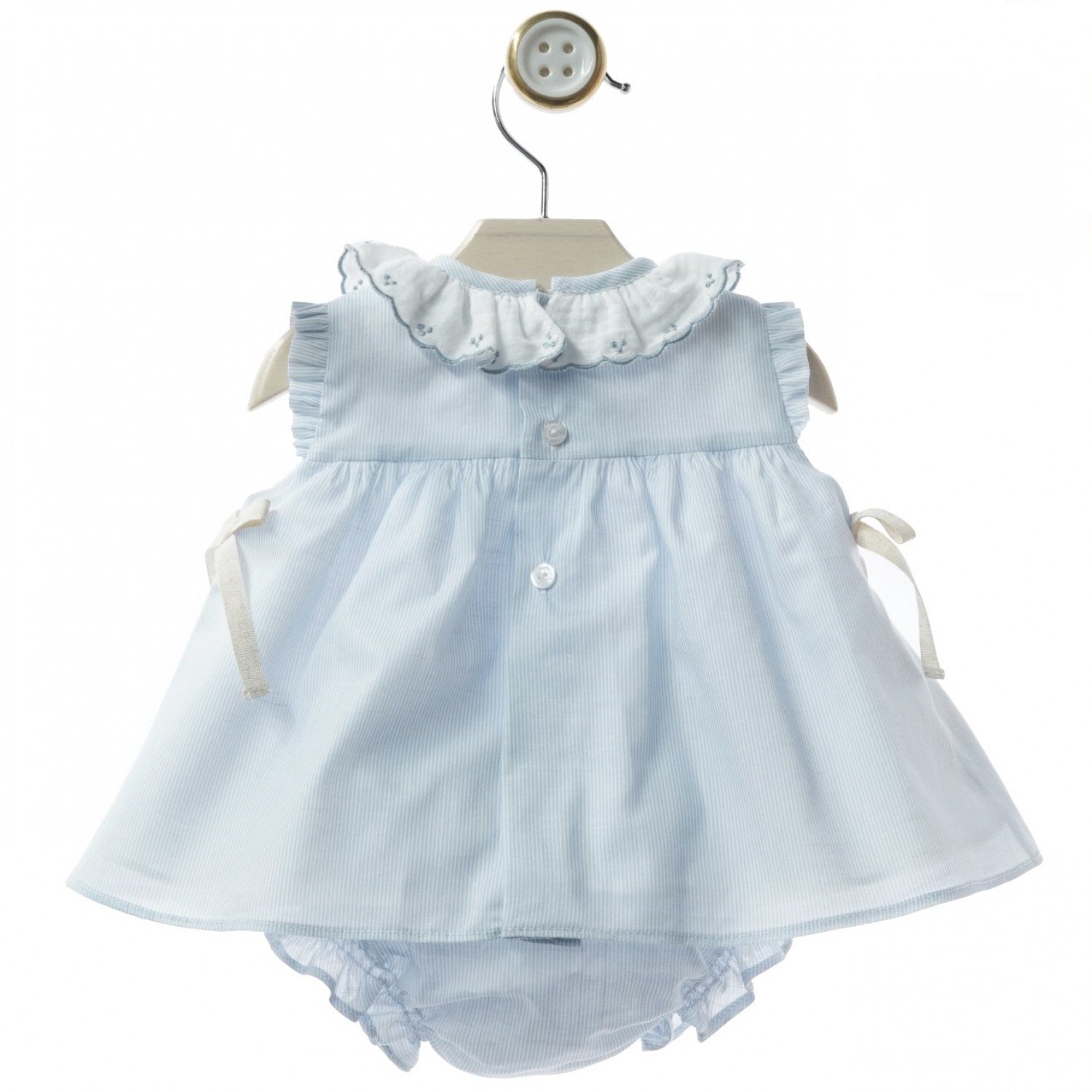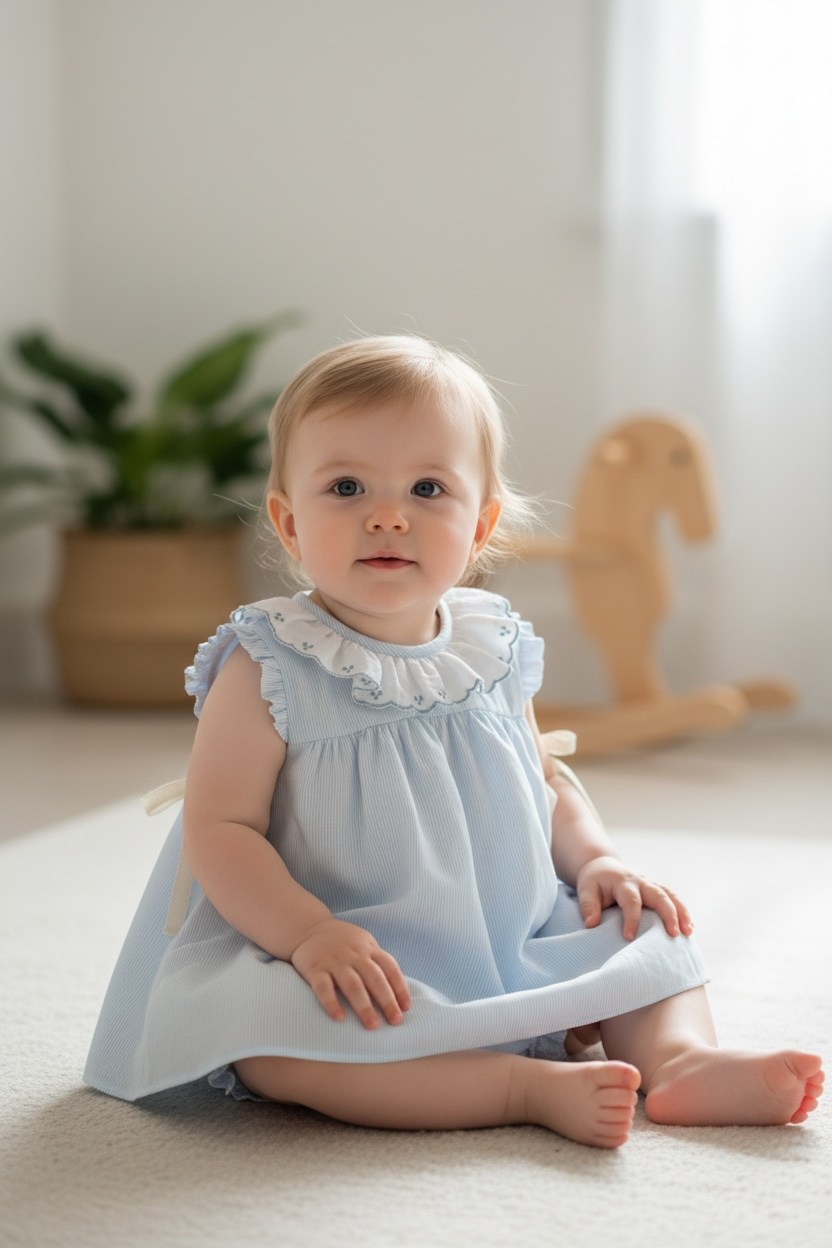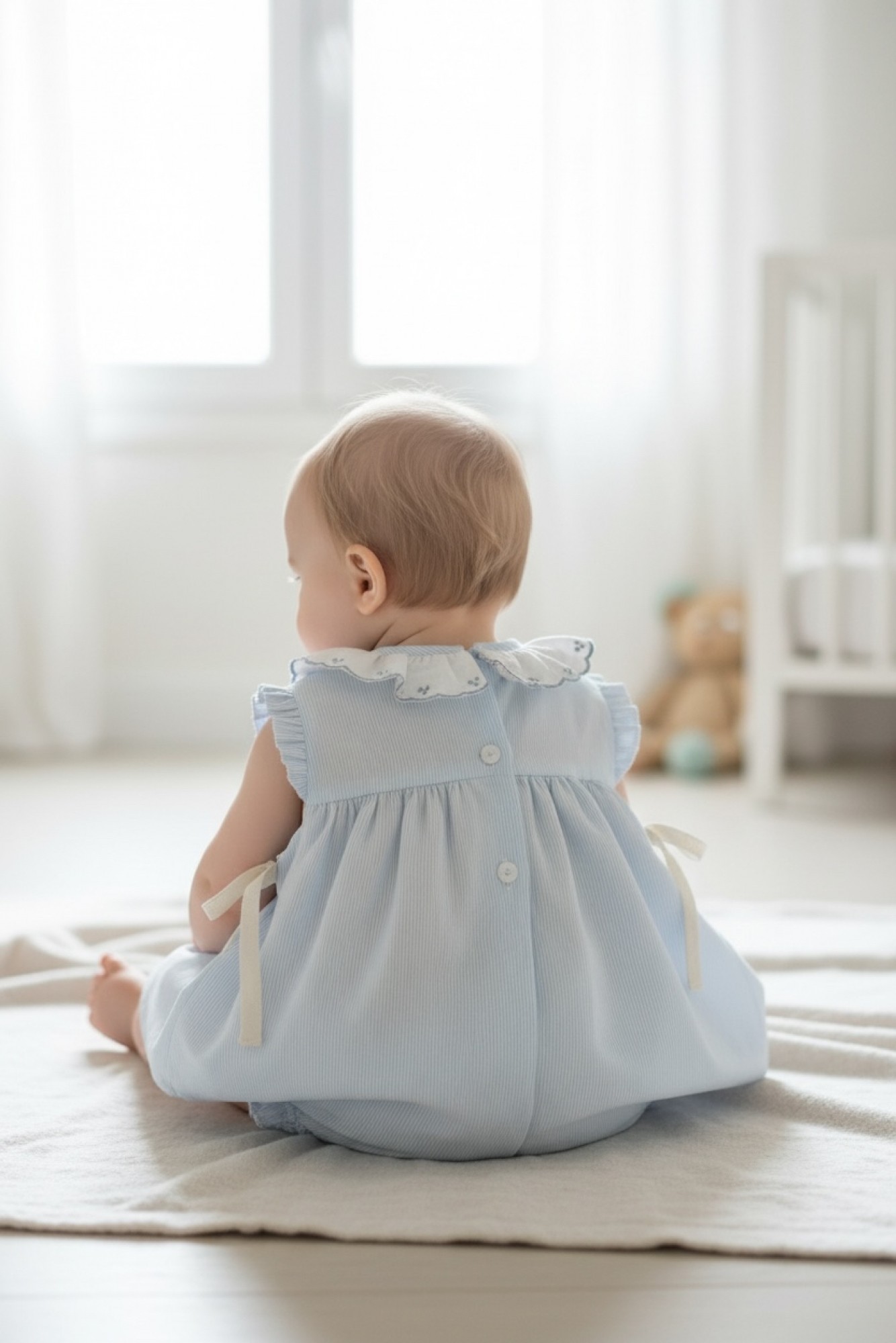 El jesusito presenta un suave tejido en tono azul claro con finas rayas, escote redondo y un bonito cuello volante en blanco con pequeños detalles bordados, que aporta un aire dulce y clásico.