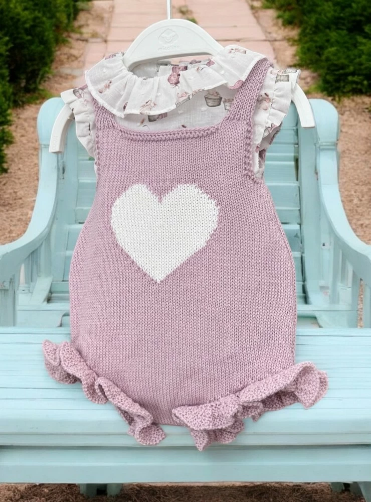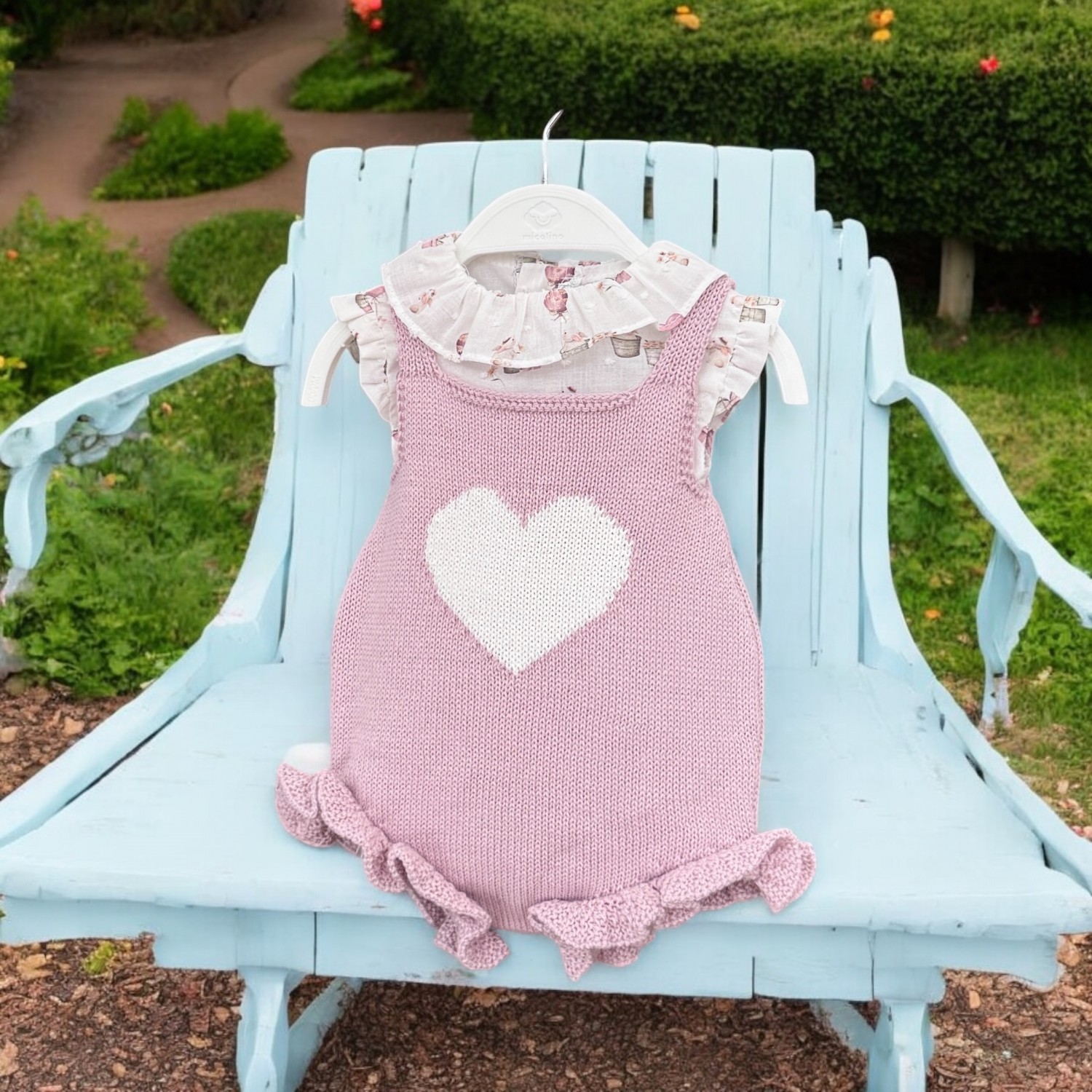 Ranita de punto rosa empolvado con un bonito corazón beige en el centro y blusa de plumeti con estampado muy fino. lleva cuello volante y manga mariposa