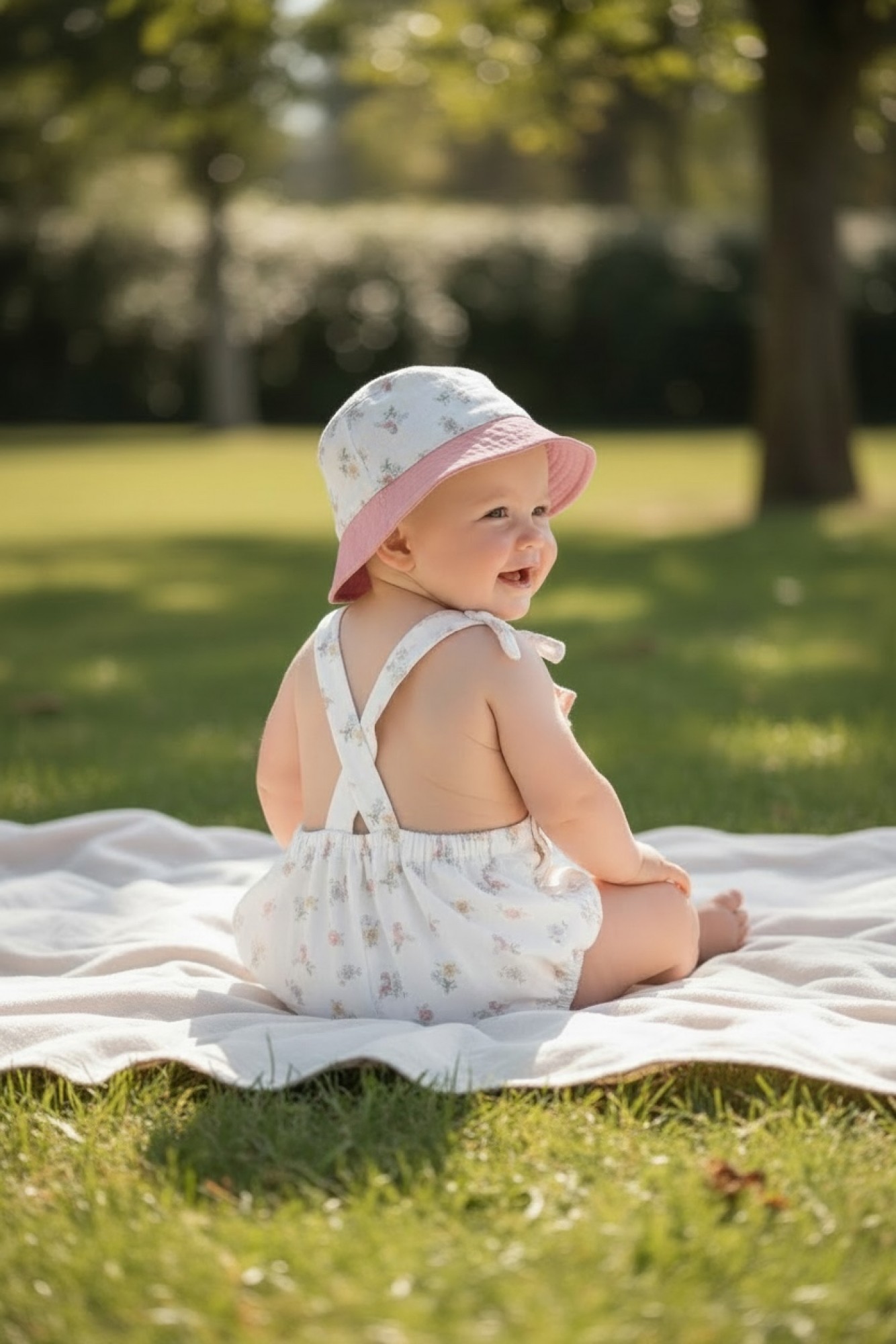 El gorrito a juego completa el look con lazadita y cintas para anudar, perfecto para paseos y ocasiones especiales.