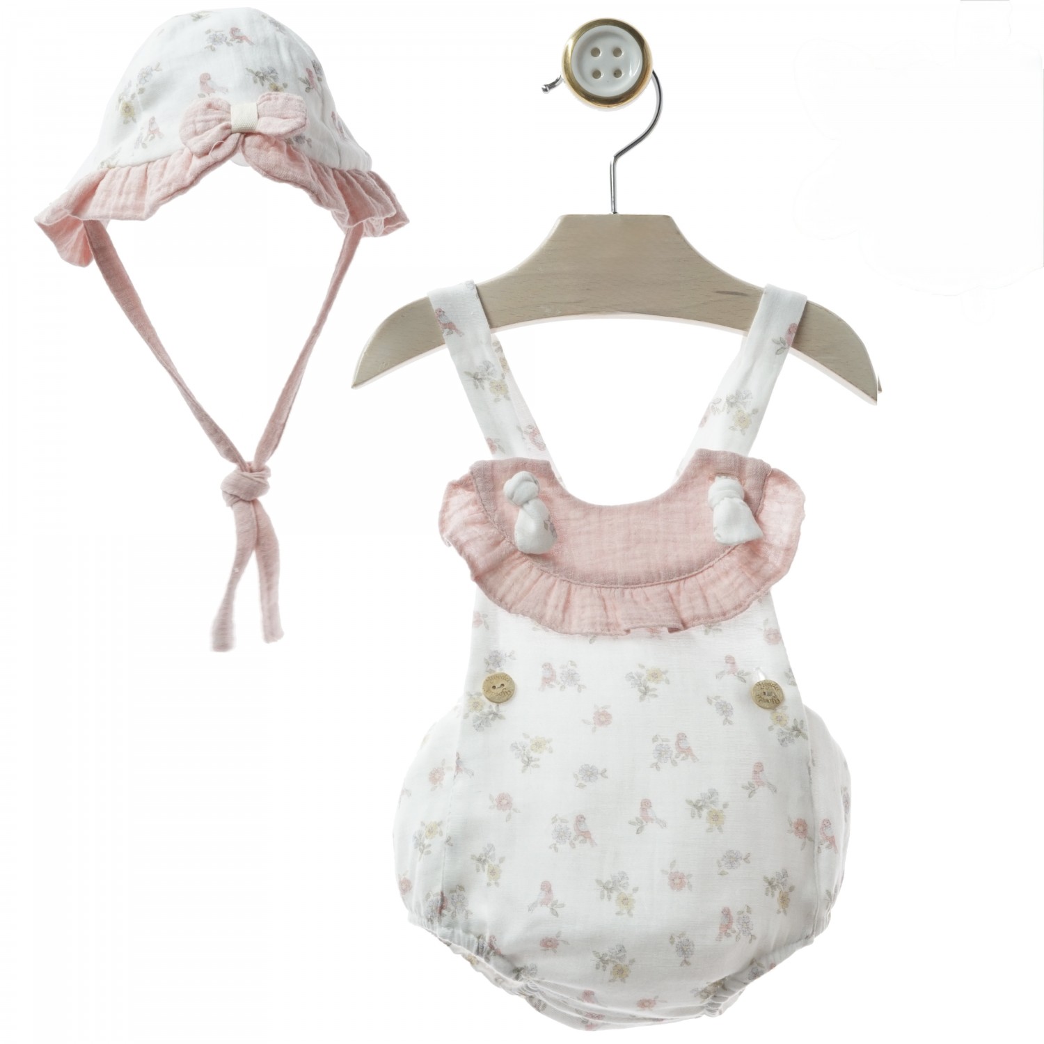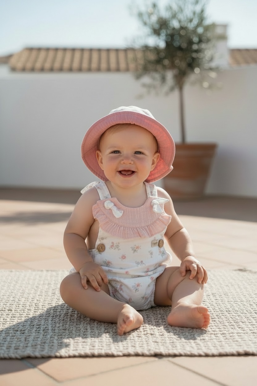 Conjunto para niña de ranita y gorrito en muselina, de la colección Provenzal, ideal para los días de sol.