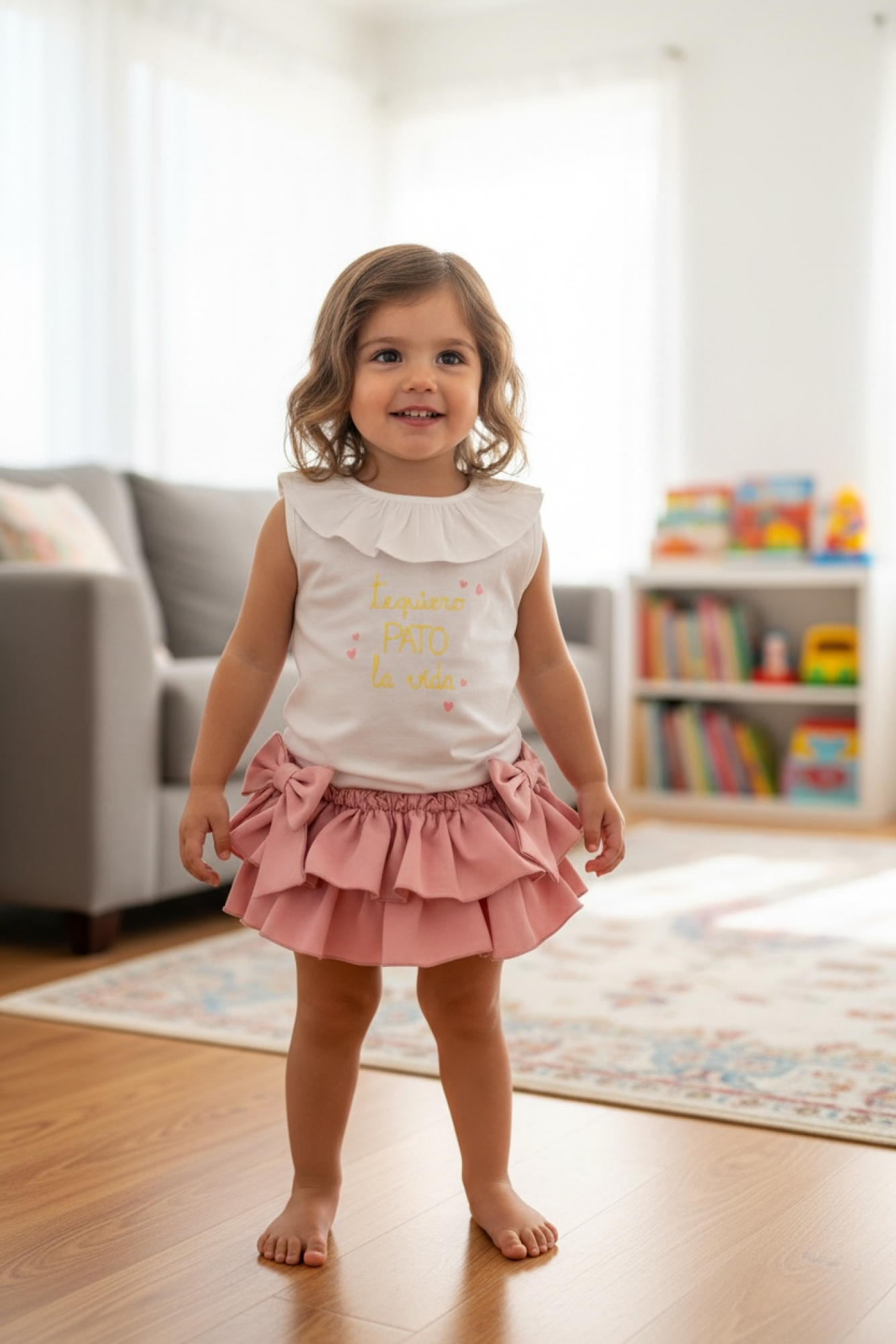 Camiseta sin mangas con cuello volante de algodón blanco con una frase muy bonita y braguita con volantes en algodón rosa empolvado
