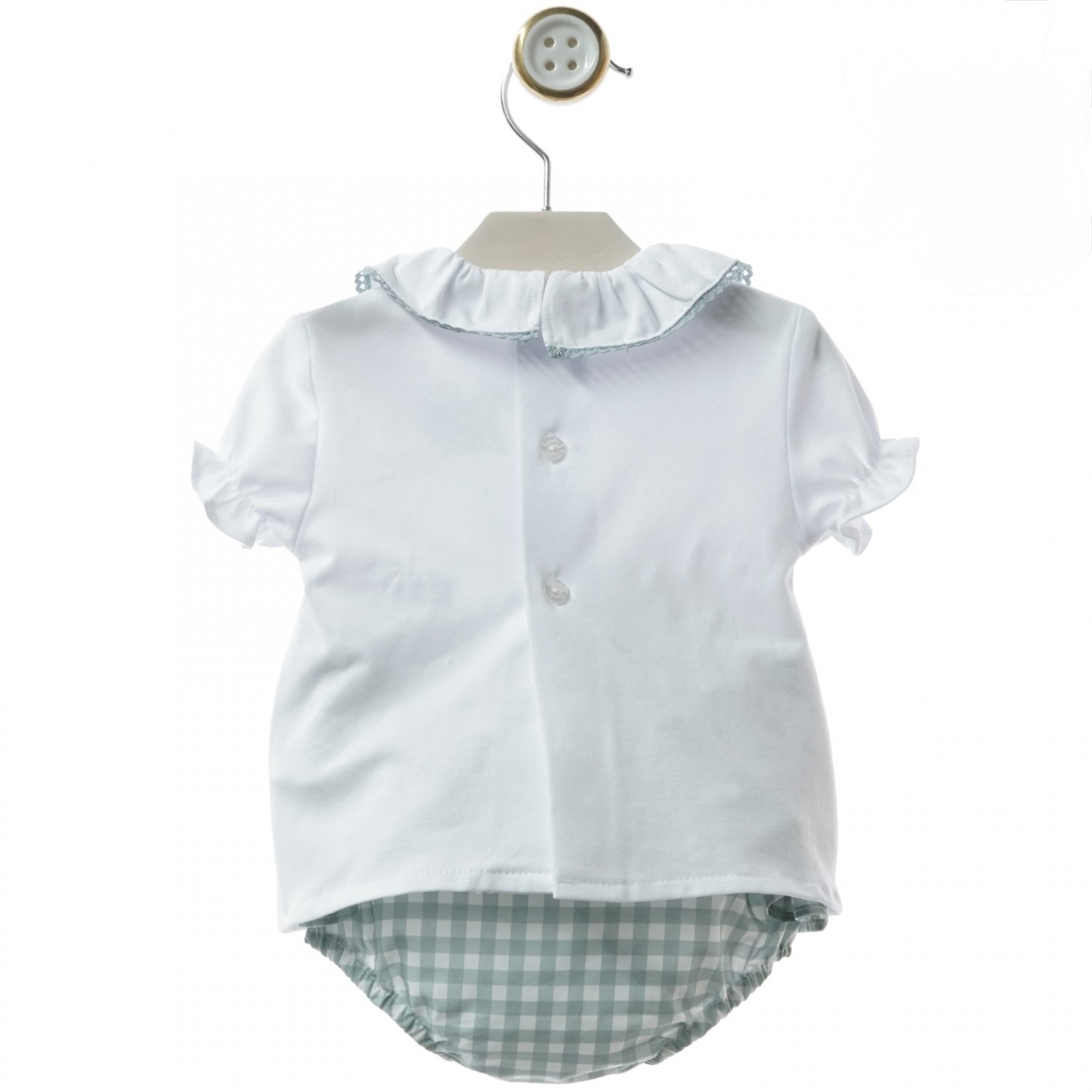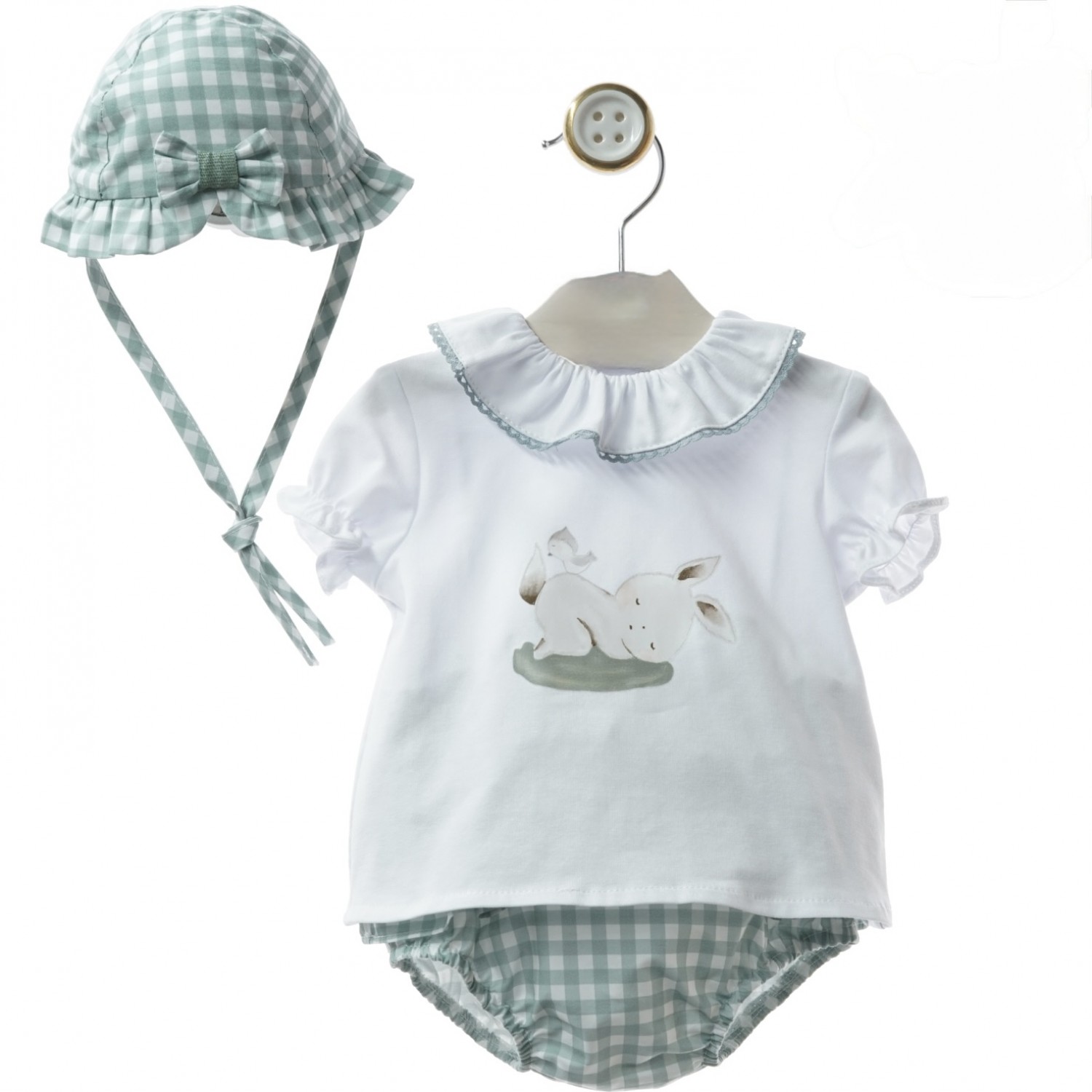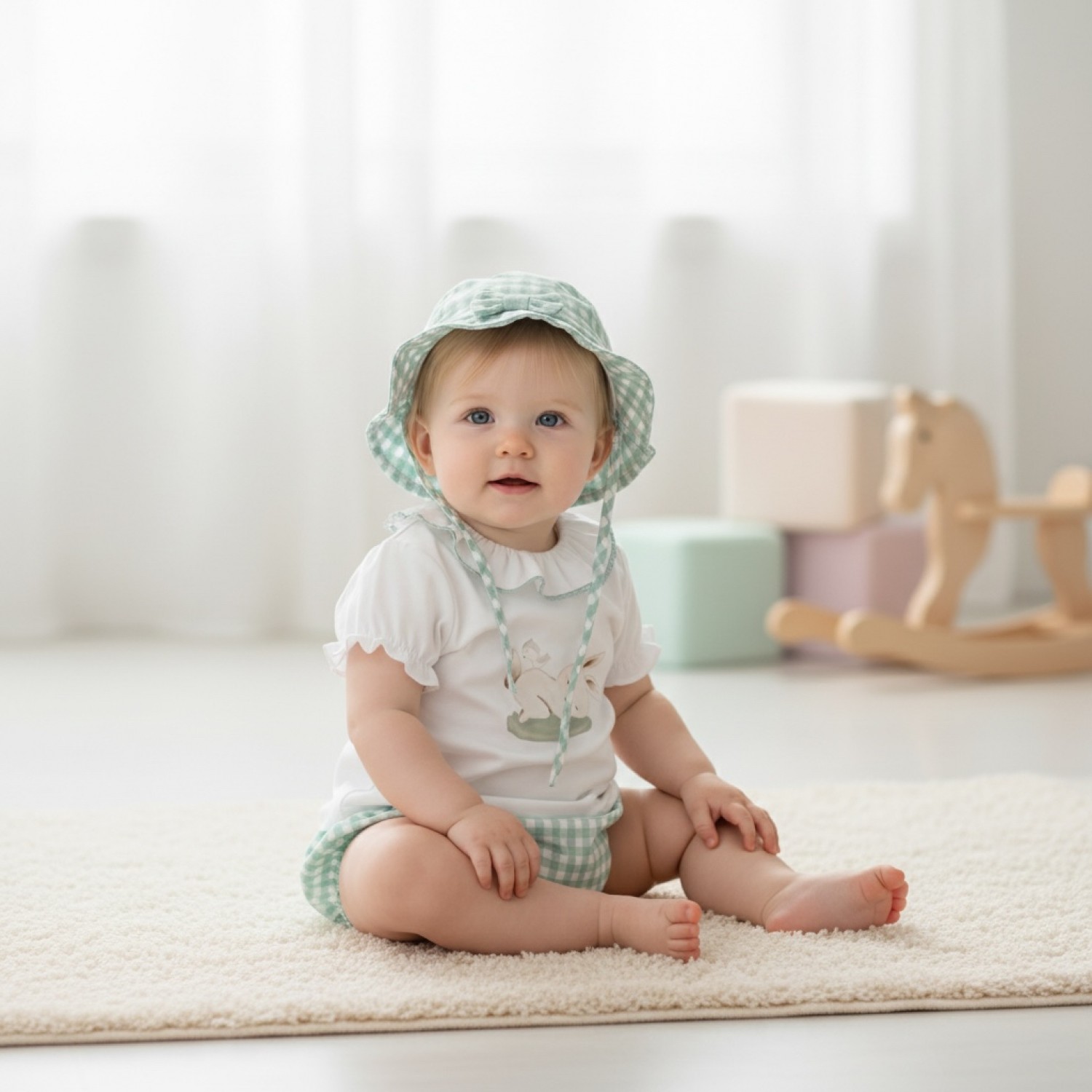 La braga en vichy verde agua incorpora volantes y goma suave para mayor comodidad y la gorrita a juego, con lazo decorativo, completa el conjunto.
