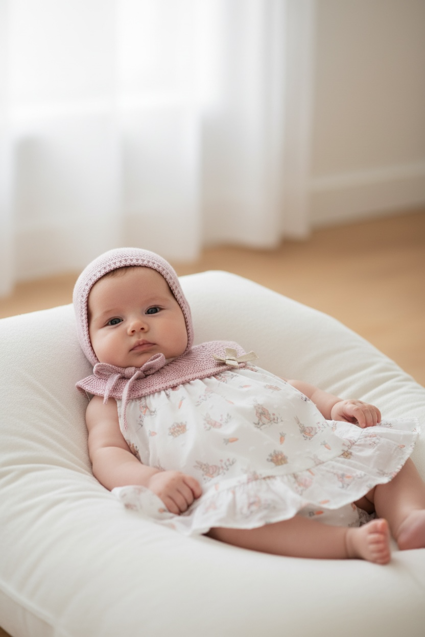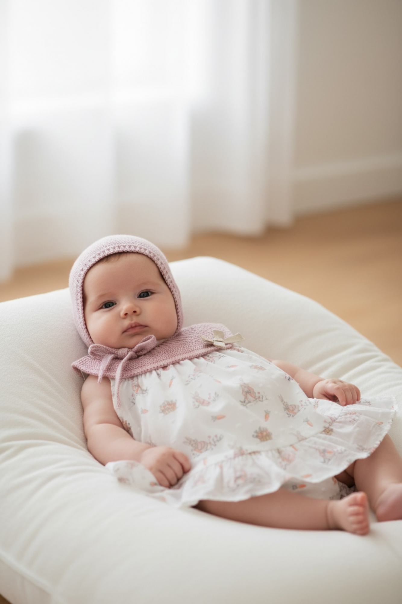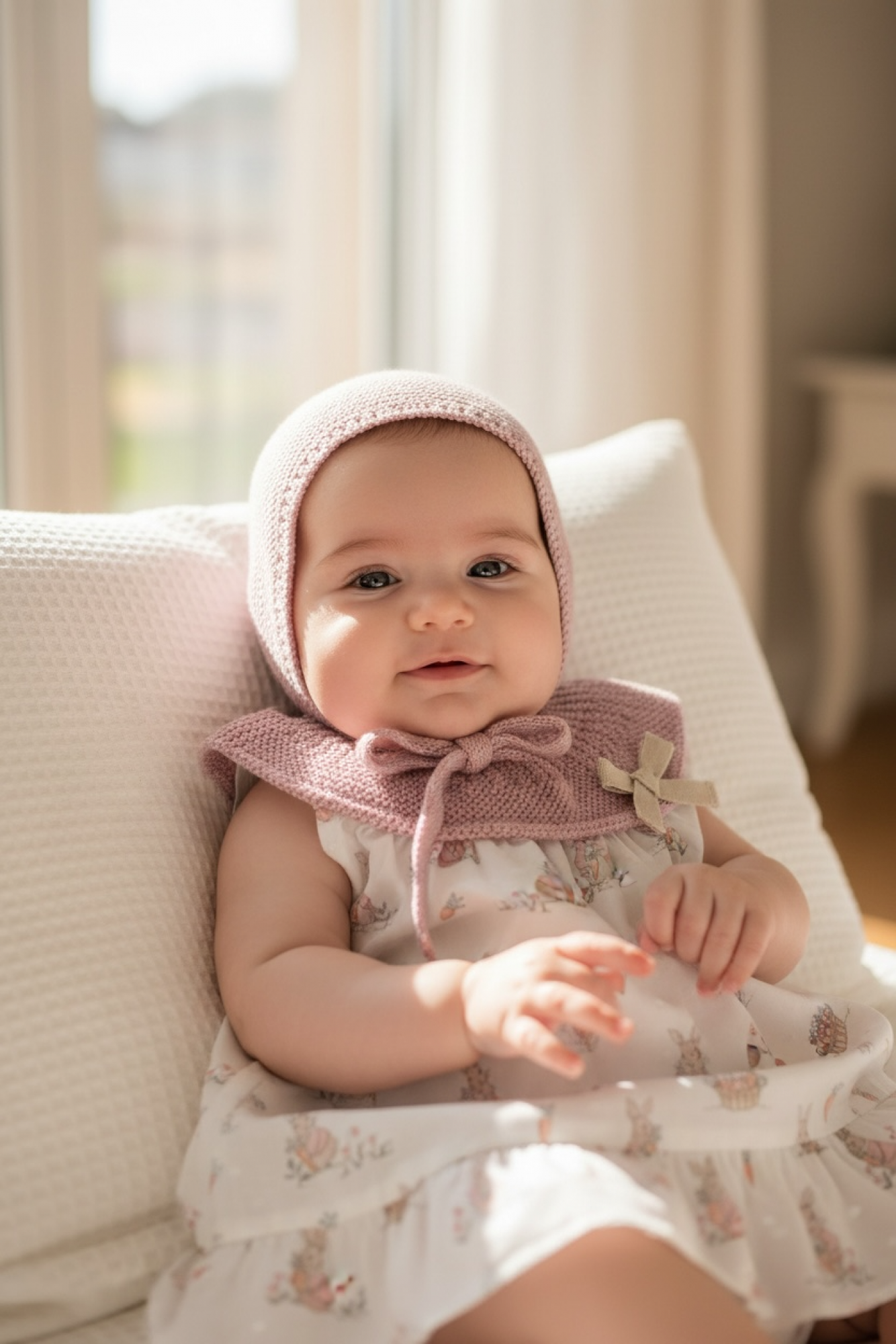 Canesú de punto en rosa, con lazo decorativo en tono neutro que le da un toque especial.