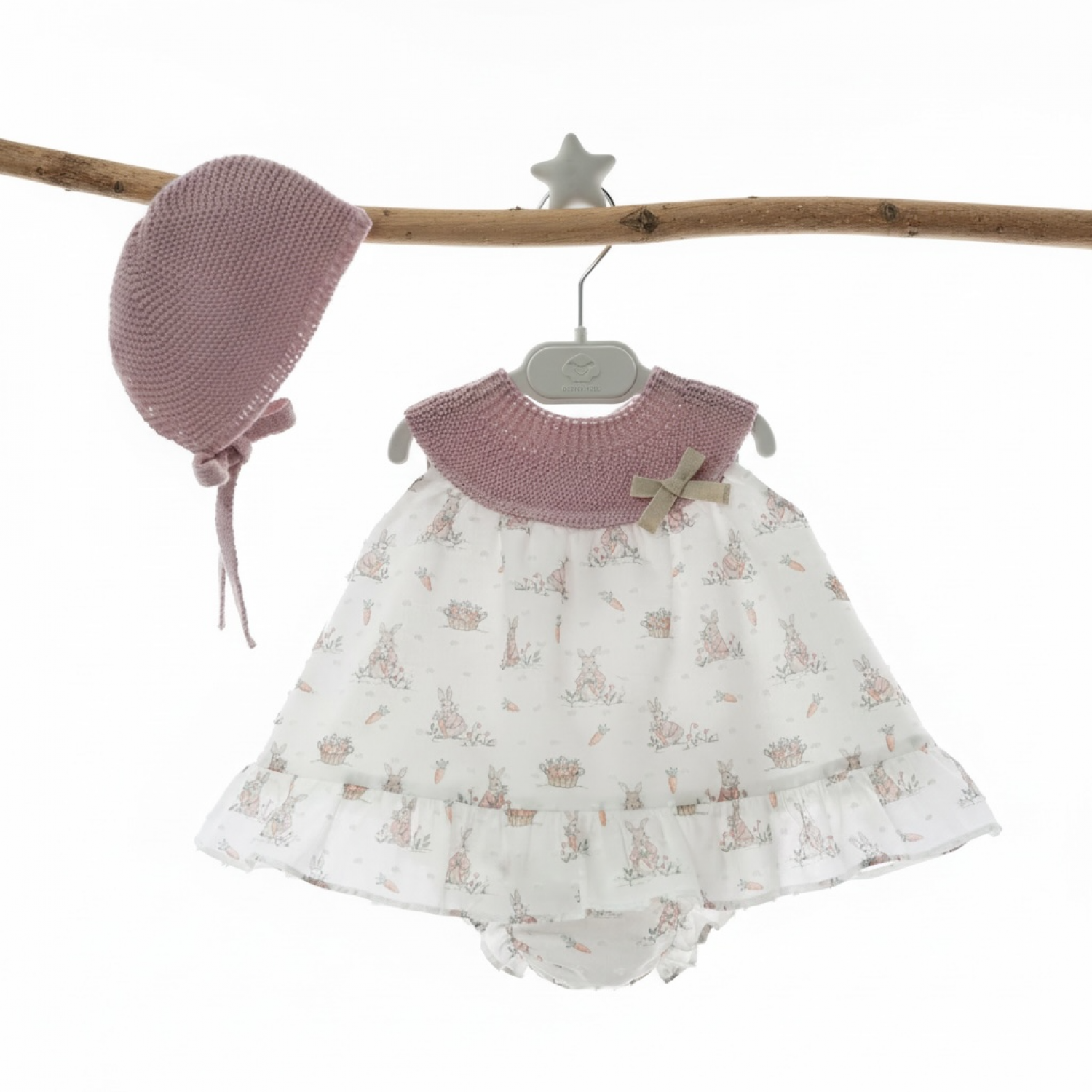 Jesusito en tejido blanco con estampado de conejitos en tonos suaves, con volante en el bajo y un acabado muy delicado.