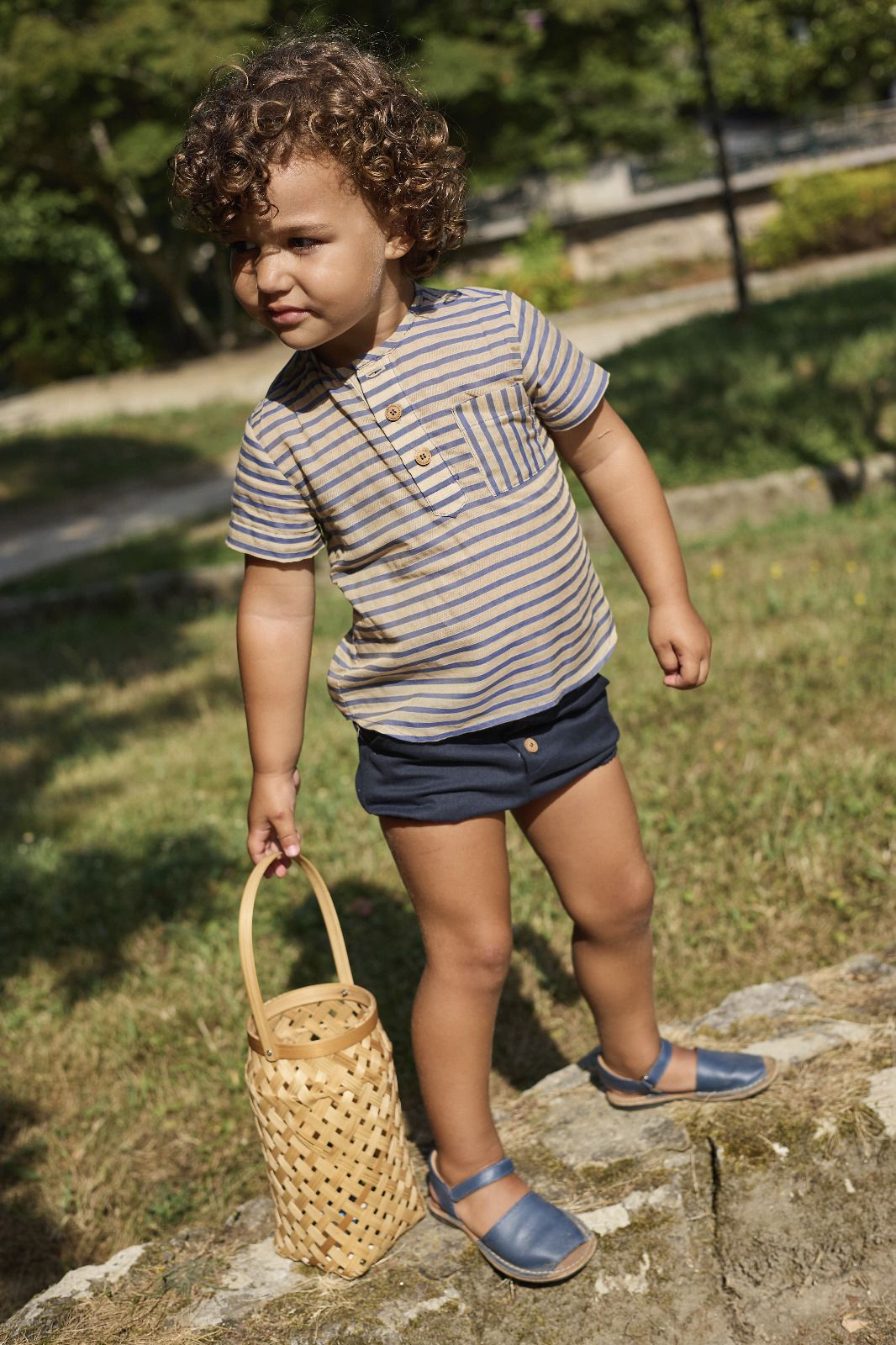 Conjunto de niño compuesto por camisa de manga corta y bombacho en tonos neutros y marino, ideal para verano.