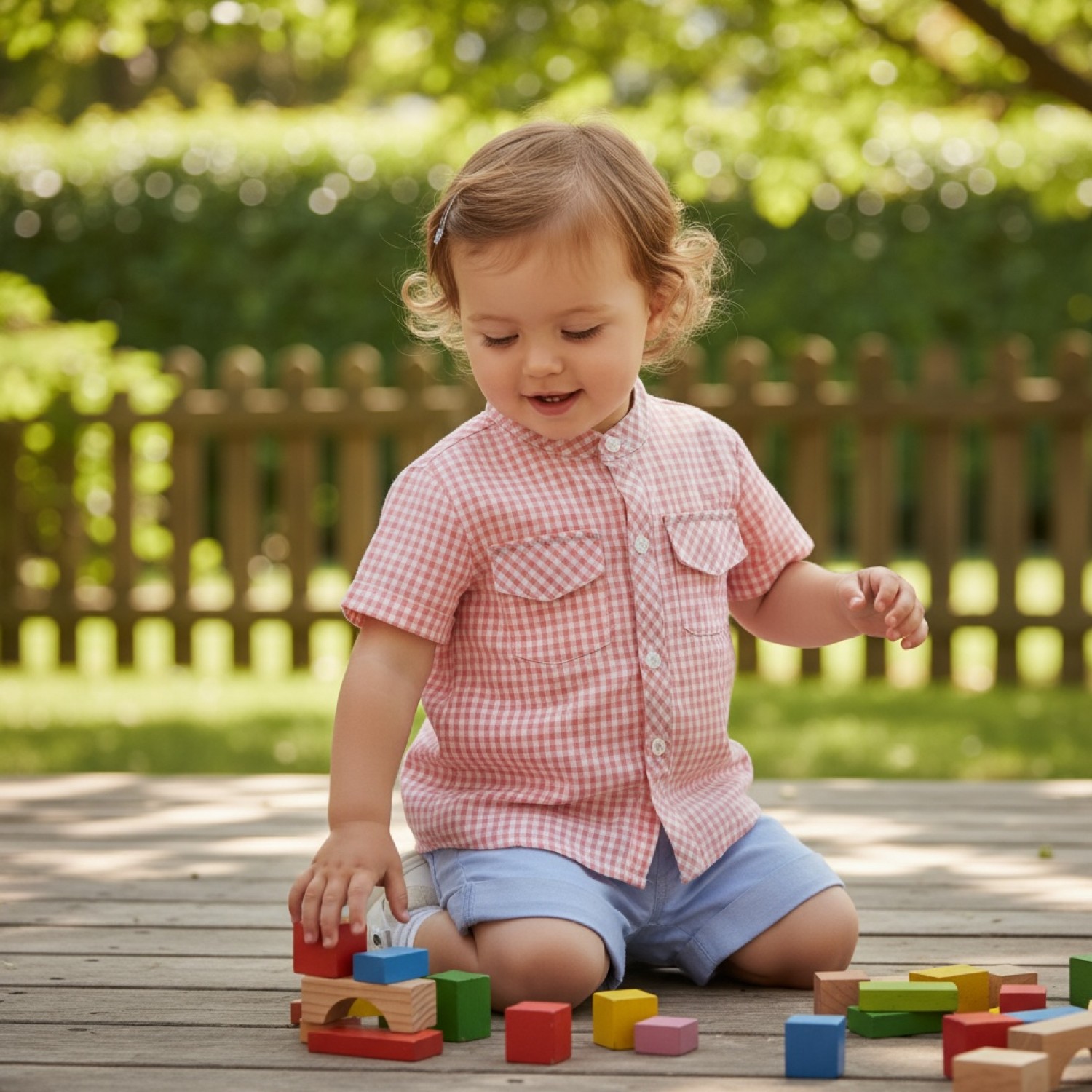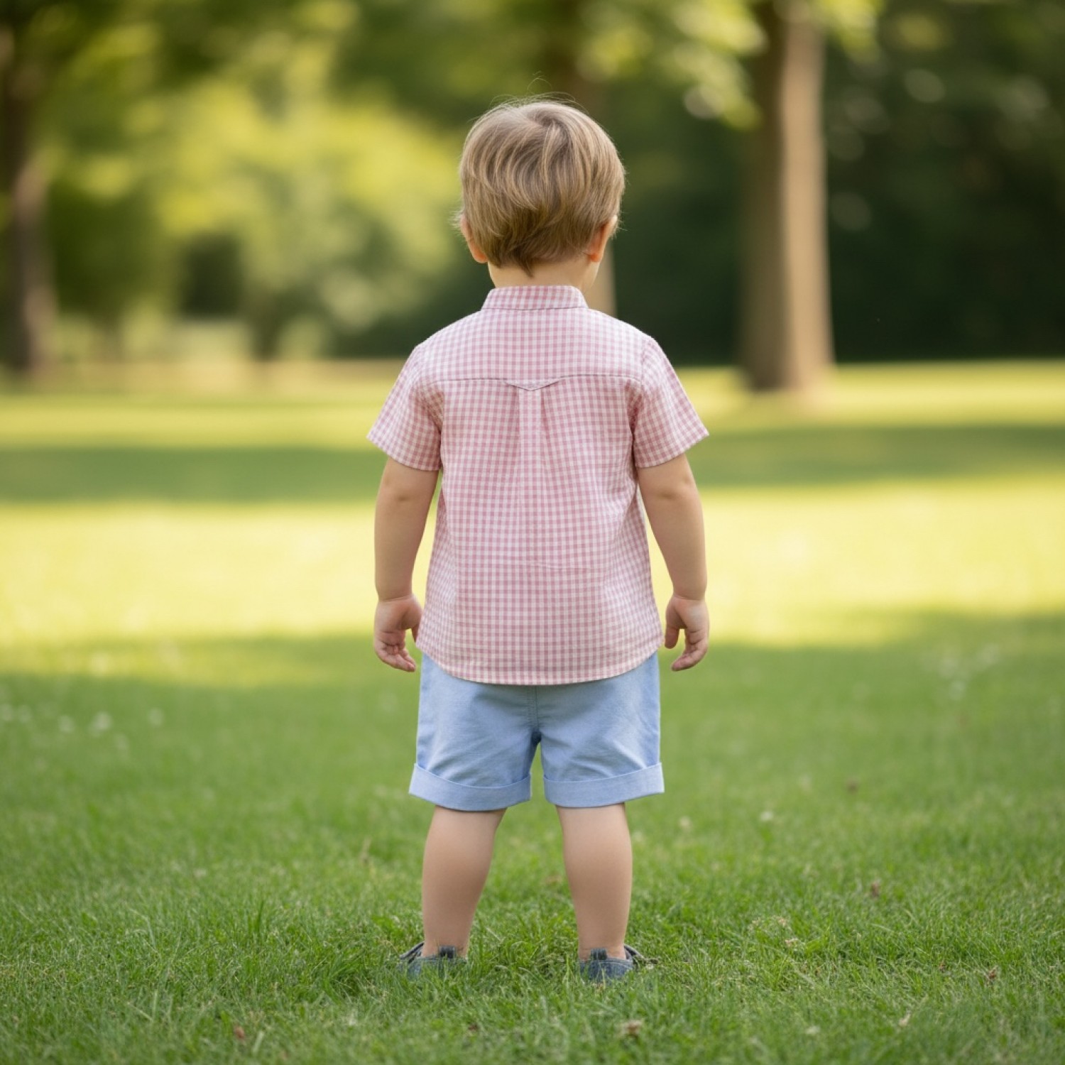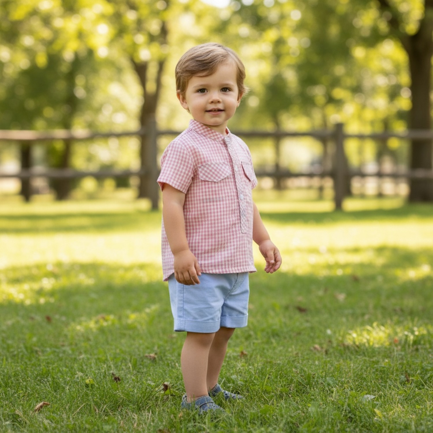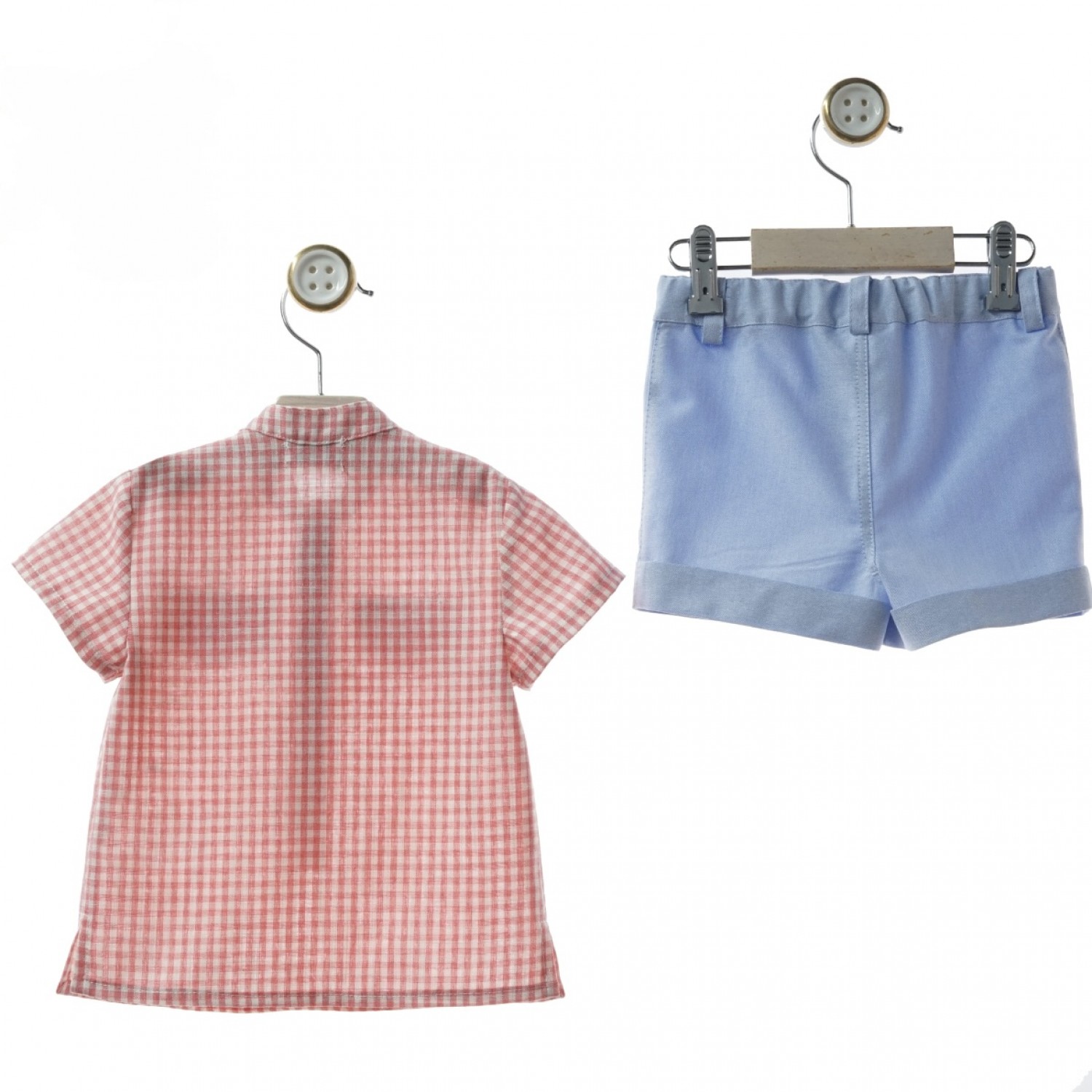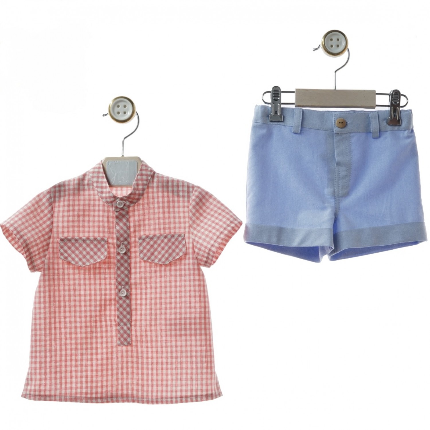 Conjunto para niño compuesto por blusa de manga corta y pantalón corto, confeccionado en tejidos ligeros y frescos, perteneciente a la colección Mayólica.